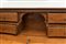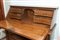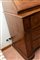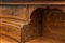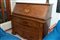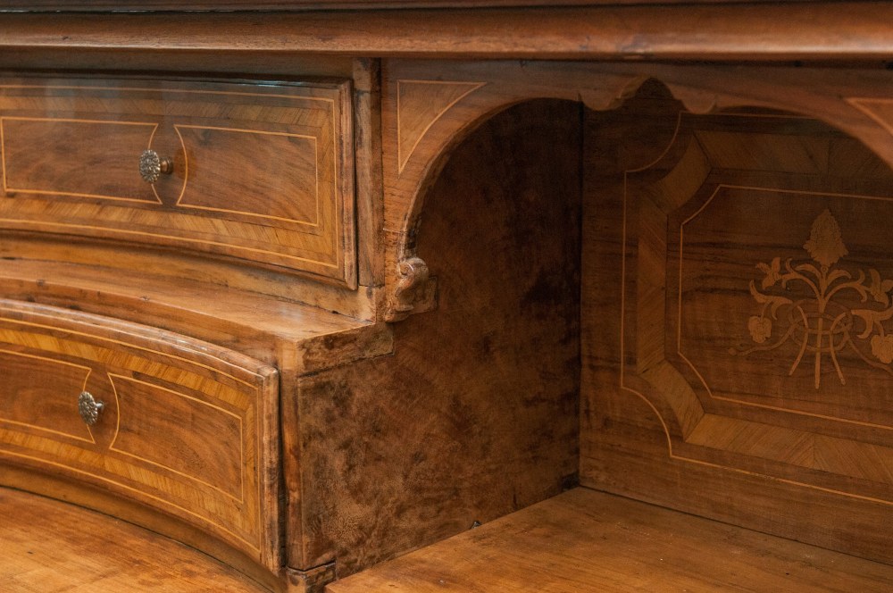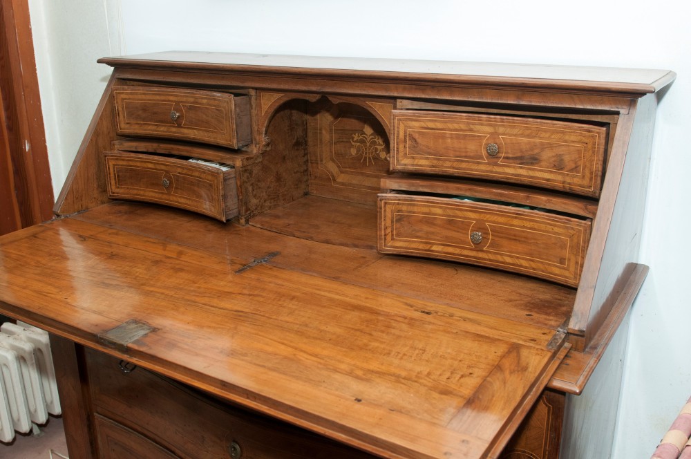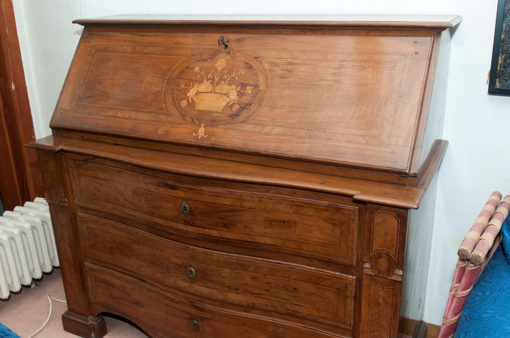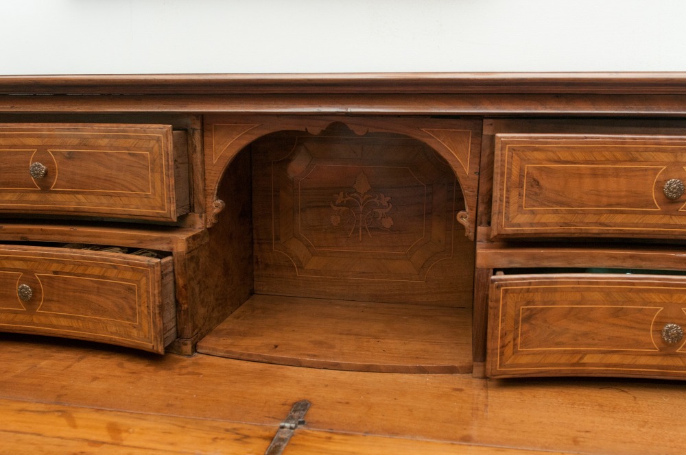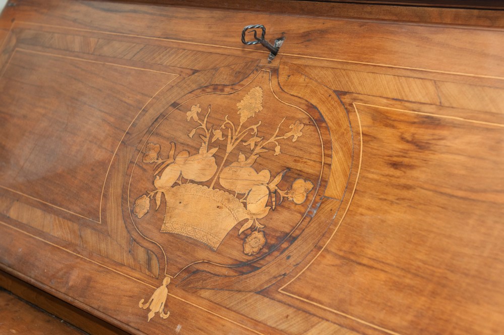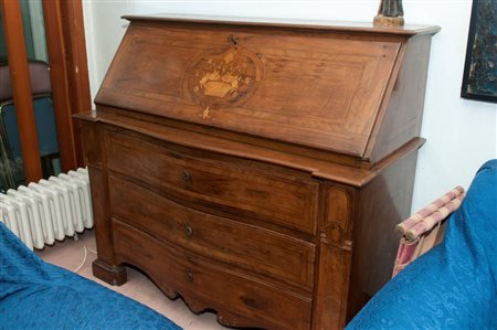120 x 136 x 57 cm e tre cassetti. Corpo con fronte a balestra e fianchi rettangolari, ribalta con all'interno quattro cassetti con scomparto. Piedi con appoggio rettangolare. Sul fronte della ribalta tarsie con cesto e frutti e riquadrature geometriche sul fronte e sui fianchi. Ferramenta in bronzo.
