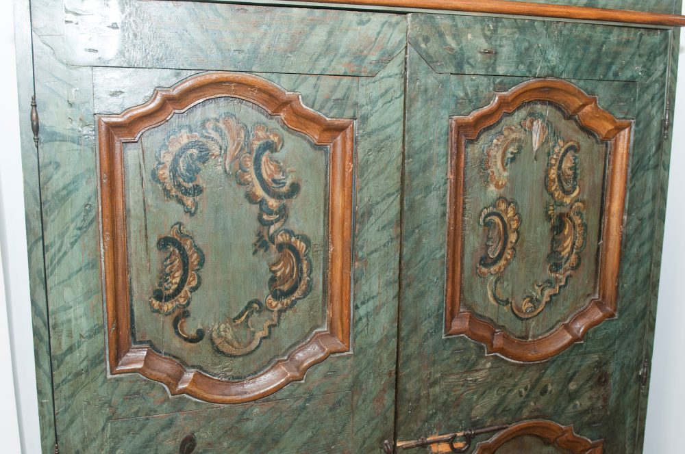 167 x 123 x 42 cm di forma rettangolare a due sportelli con riquadrature a cornici dorate e piedi a mensola. Decoro a roccailes sul fronte. All'interno tre ripiani.