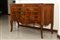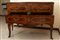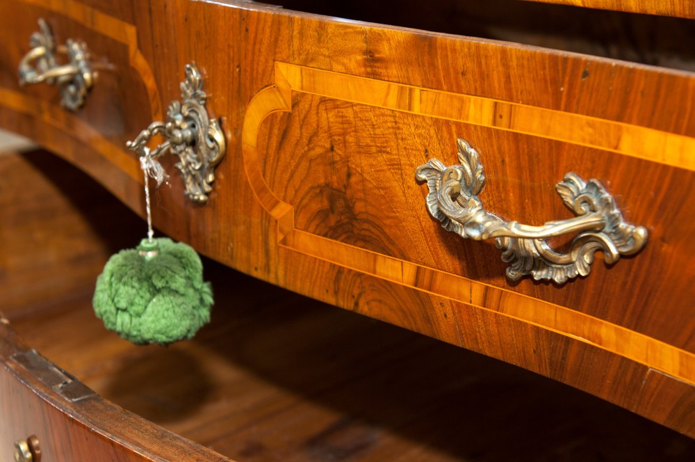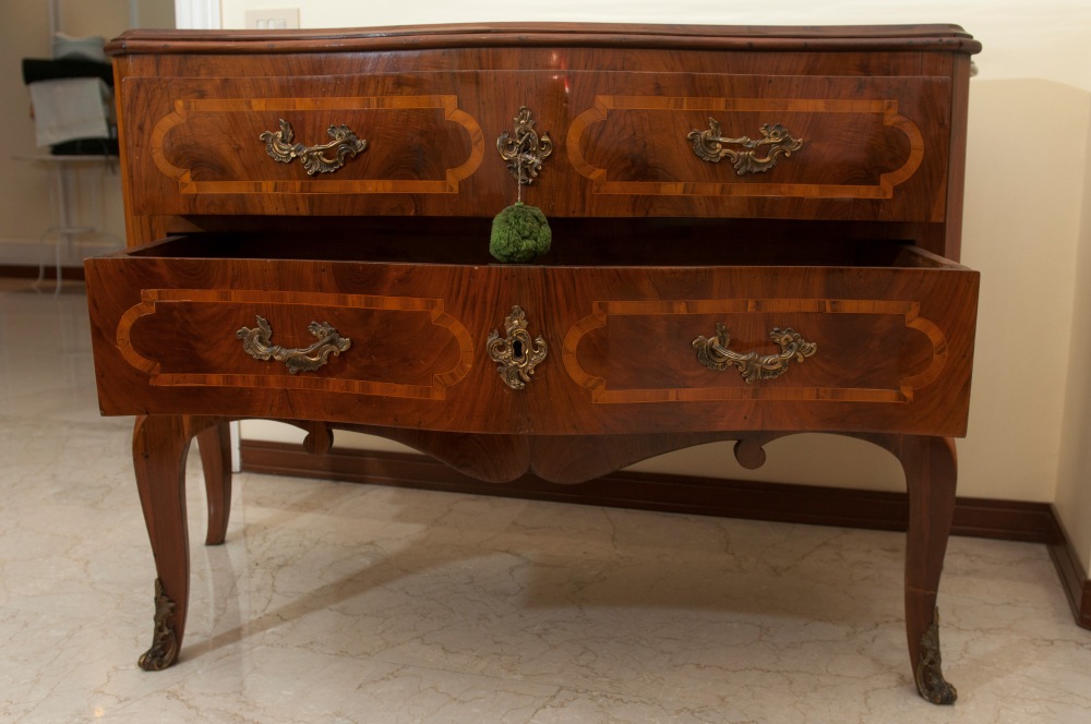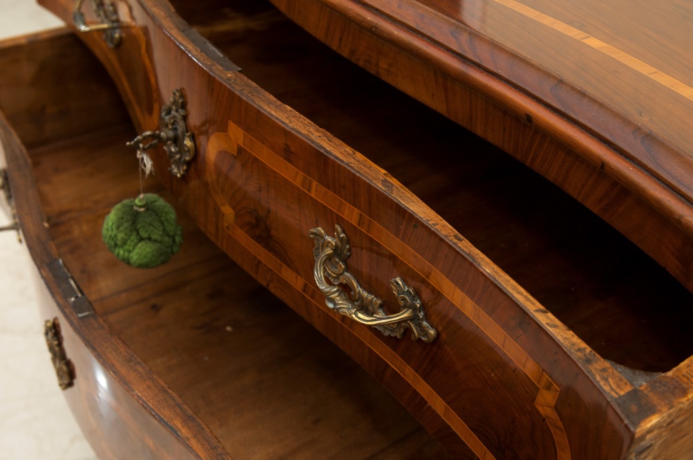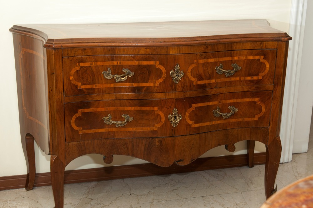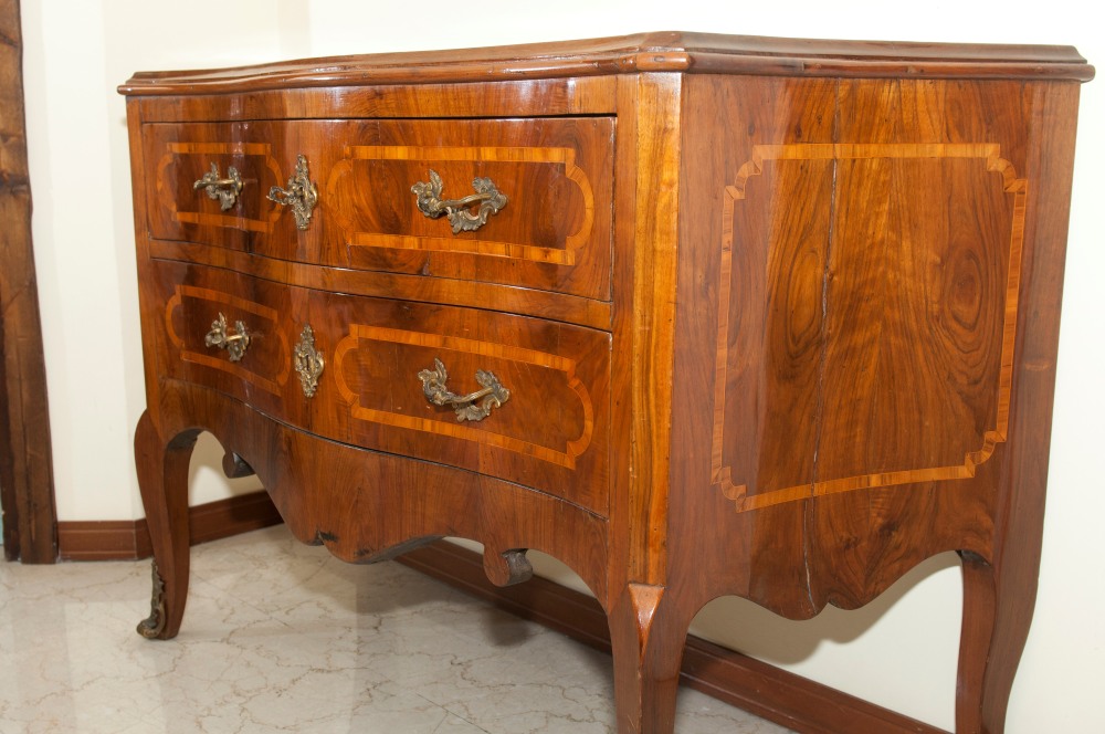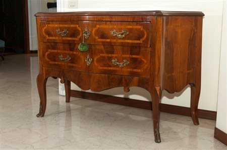 84 x 133 x 53 cm a due cassetti, fronte a balestra fianchi centinati e gambe a sciabola, riquadrature in legno di frutto sul fronte , fianchi e piano. Ferramenta in bronzo cesellato con calzari alle gambe anteriori.