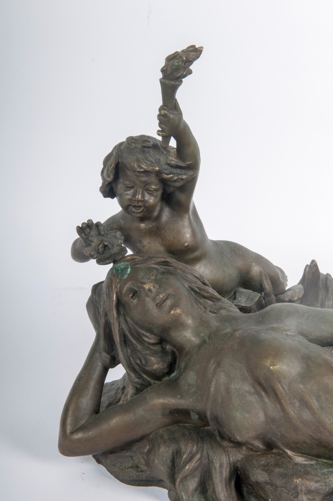 Ninfa con amorino, scultura centrotavola in bronzo