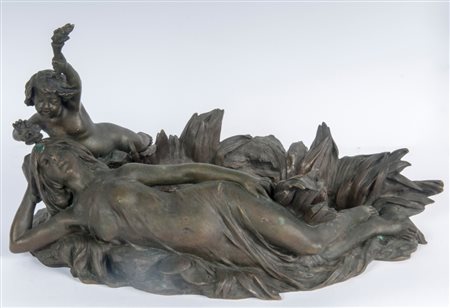 EMIL FUCHS (1866 - 1929) Ninfa con amorino, scultura centrotavola in bronzo 25 x 50 x 32 cm