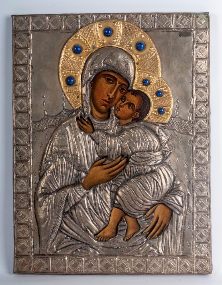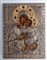 stampa su carta in policromia 42,5 x 32 x 2 cm icona di gusto bizantino con rizza in metallo argentato e nimbi dorati. Finiture in lapislazzuli.