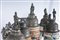 34 x 11 cm; 30 x 11 cm in ceramica policroma con coperchio in peltro dei quali quattro sormontati con militari e uno da mitragliatrice.