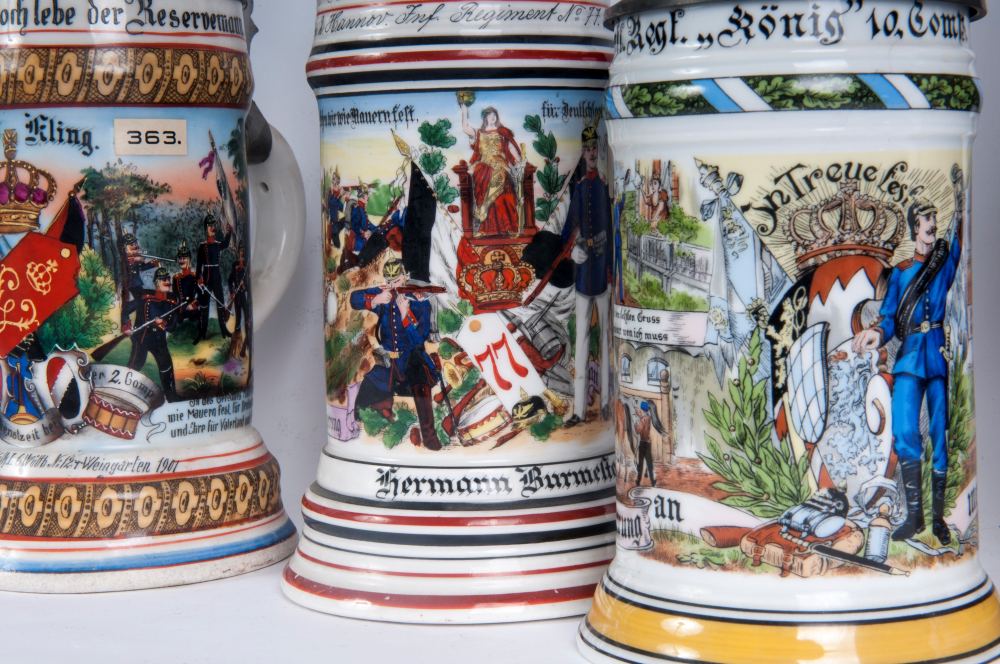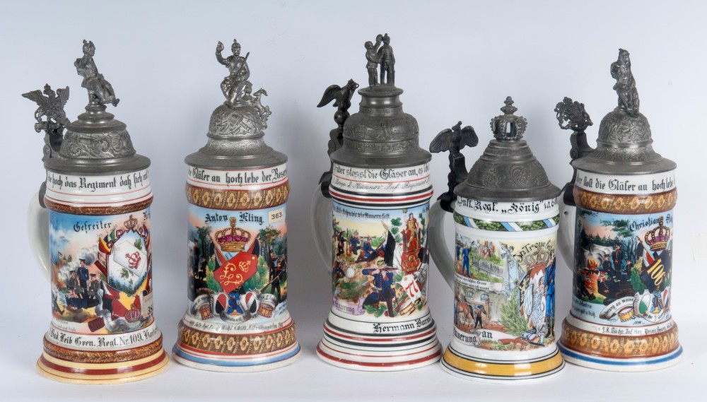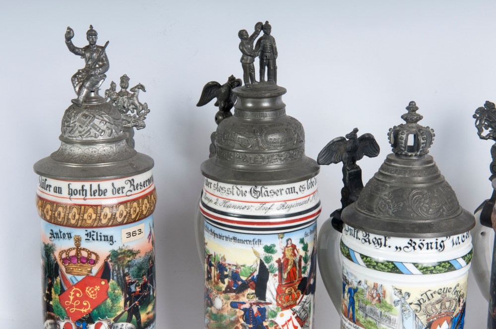 Boccale del riservista, lotto di cinque primo quarto del XX secolo 30 x 11 cm; 24 x 11 cm
