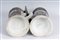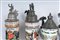 30 x 11 cm; 24 x 11 cm in ceramica policroma con coperchio in peltro dei quali quattro sormontati da militari e uno da corona.