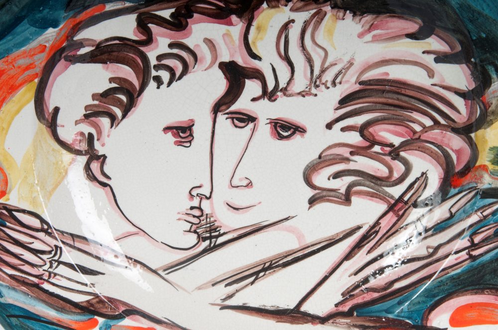 diametro 49,5 x 7,5 cm Decoro con teste di giovani su fondo a taches gialle, rosse e verde acqua. Firmato al fronte e al retro p.a. Manifattura G. Rossicone Milano