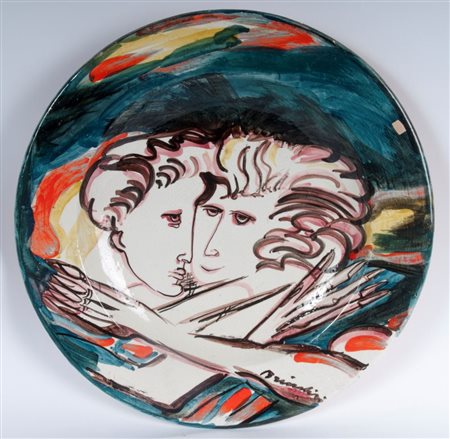 REMO BRINDISI (Roma, 1918 - Lido di Spina, 1996) Piatto da pompa in ceramica policroma seconda metà XX secolo diametro 49,5 x 7,5 cm