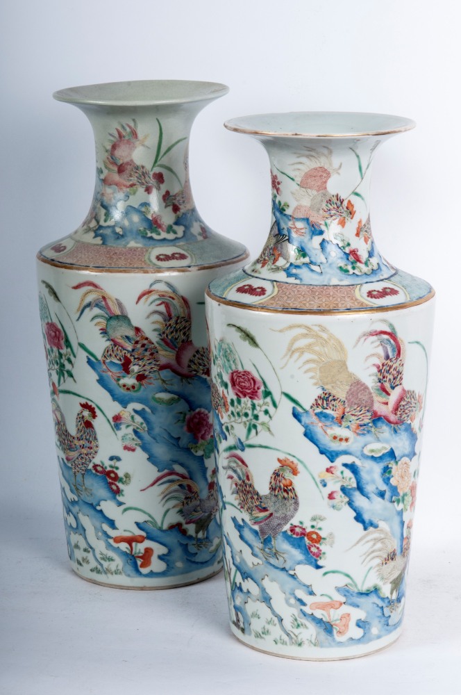 35 x 12,5 x 11,5 cm dal corpo svasato verso il basso con collo a rocchetto e labro dell'orlo estroflesso. Decoro alla peonia con galli su isole rocciose.