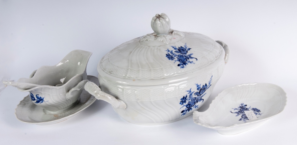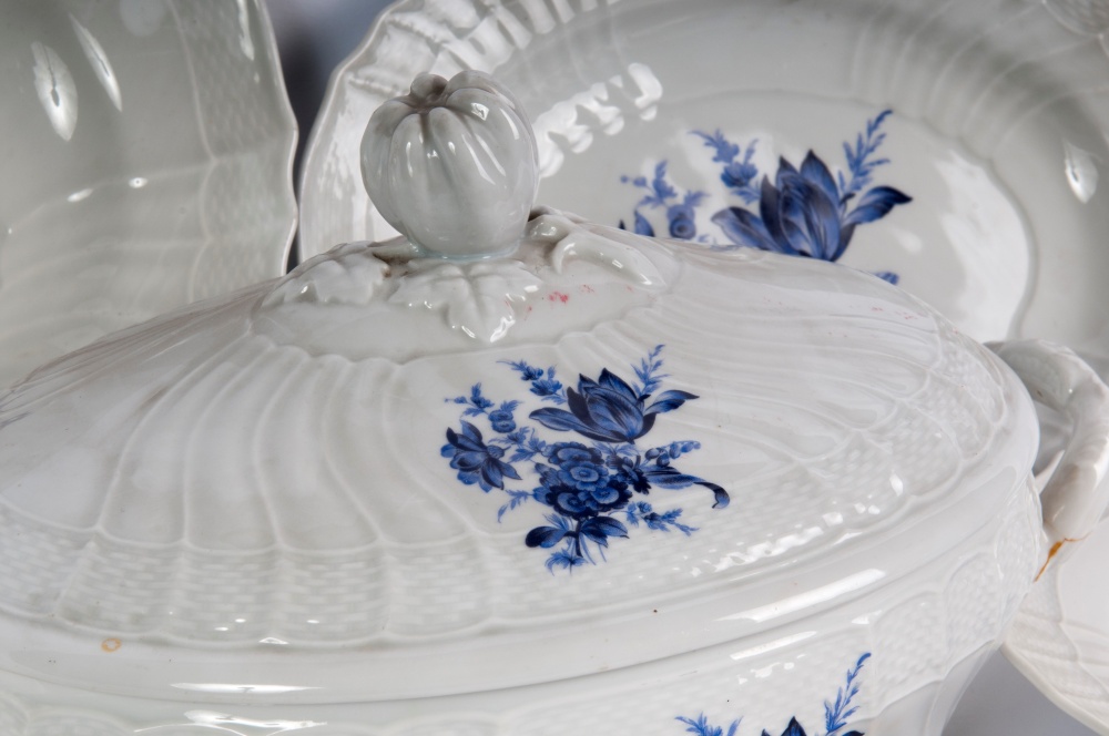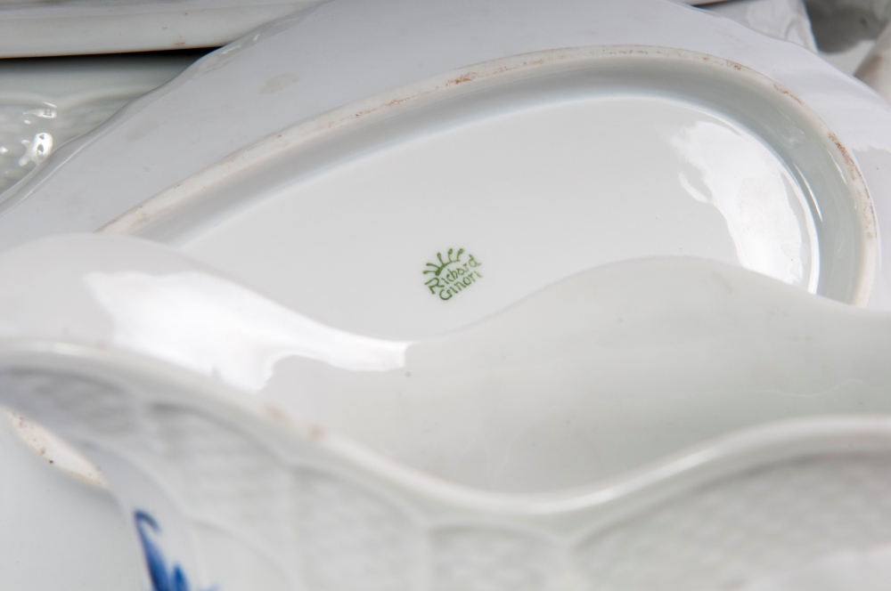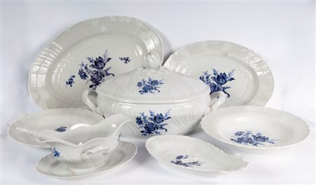 Composto da: 12 scodelle, 24 piatti da coltello, 12 piatti da desserts, 10 mezze lune, 8 piatti da servizio a forme e dimensioni differenti, una salsiera con cucchiaio , una insalatiera ed una zuppiera, 3 vaschette bianche quadrilobate, 6 tazze da caffè con piatto pz. tot. 85