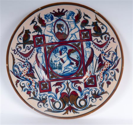 diametro 38,5 x 4,7 cm a tutto fondo con leggero incavo centrale. Decorato a putti ed animali fantastici entro riquadrature e riserve circolari in rosso rubino su fondo bianco, nelle cromie blu e giallo oro con la tecnica del lustro. Retro con appoggio ad anello a fondo ribassato. Orlo del piatto in oro a lustro. Piatto non firmato, ultimo quarto XIX secolo