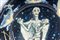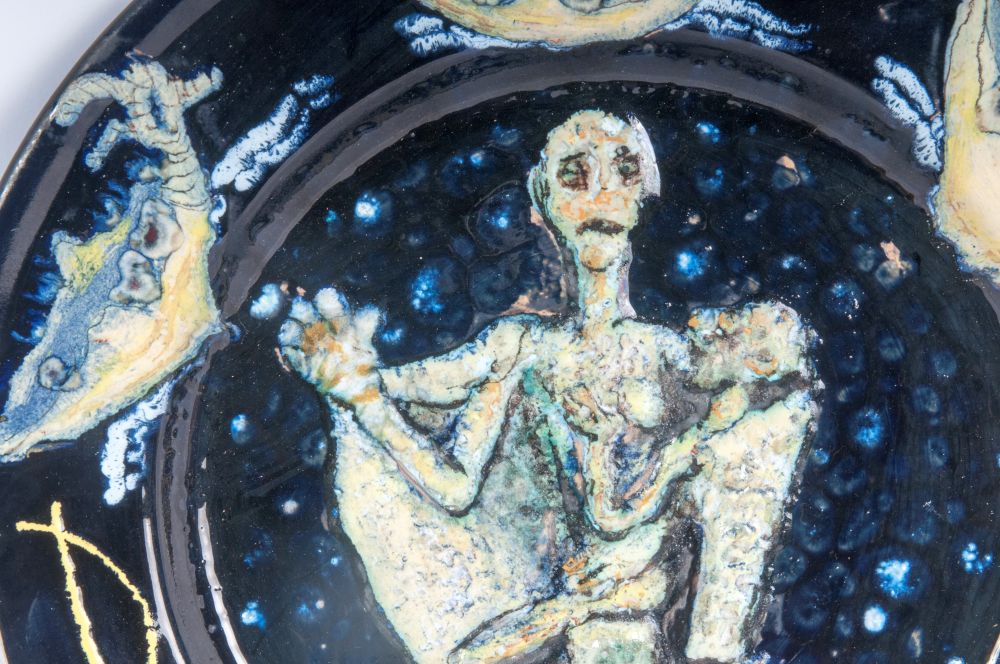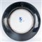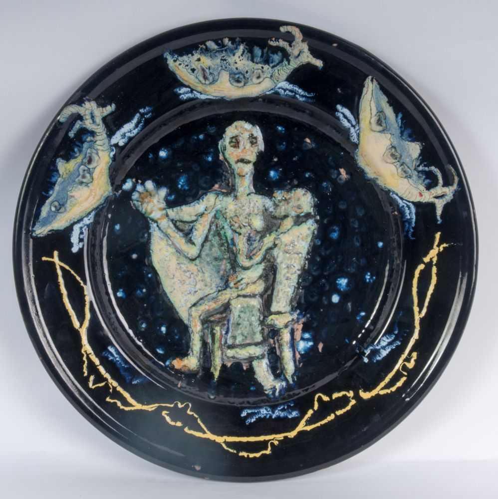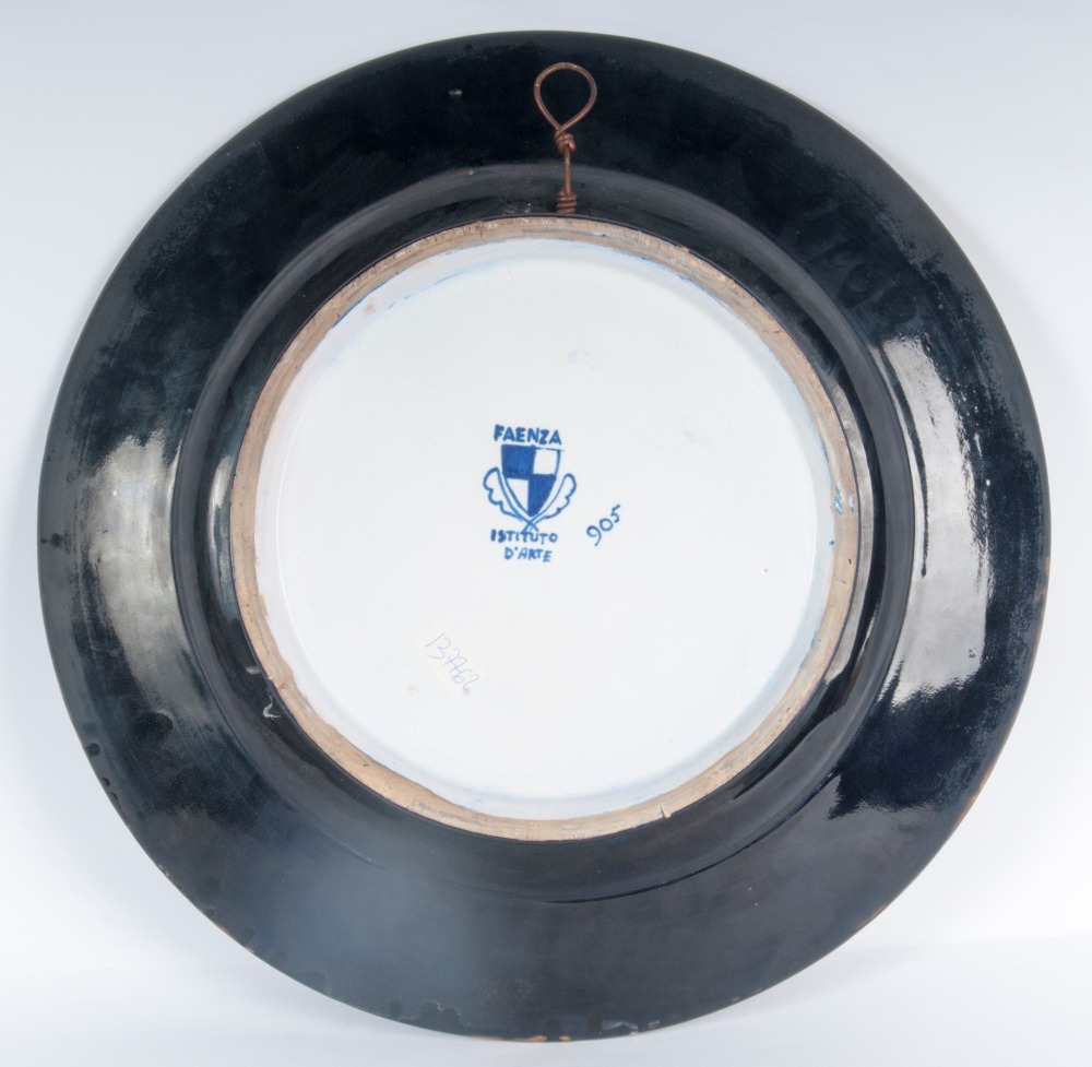 diametro 52 x 7 cm dall'ampia tesa, corta balza e vasto fondo. Orlo del piatto con labbro leggermente rialzato, retro con appoggio ad anello e fondo ribassato. Decoro su fondo blu notte con smalto a rilievo. Figure di balene stilizzate nella tesa e Vergine con il Bambino nel fondo. Al retro in blu sotto smalto Istituto d'Arte Faenza e numero di matricola 905 corrispondente all'autore e agli anni 1954/55.