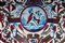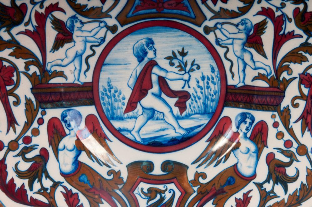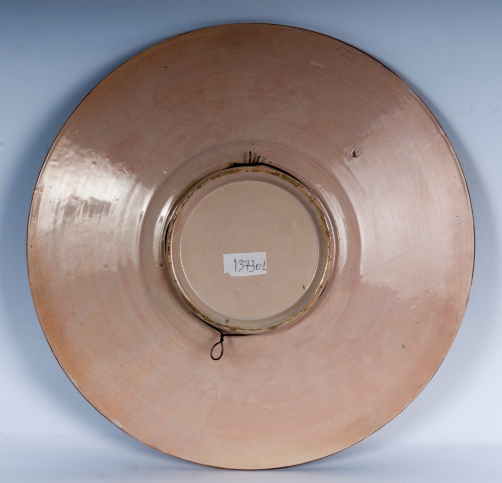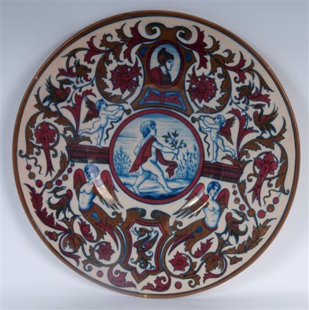 diametro 38,5 x 4,7 cm a tutto fondo con leggero incavo centrale. Decorato a girali con putti ed arpie e figure di giovinetto entro riserve tonde su fondo bianco, cromie in rosso rubino, oro e blu su fondo bianco con con la tecnica del lustro. Retro con appoggio ad anello a fondo ribassato. Orlo del piatto in oro a lustro. Non firmato.
