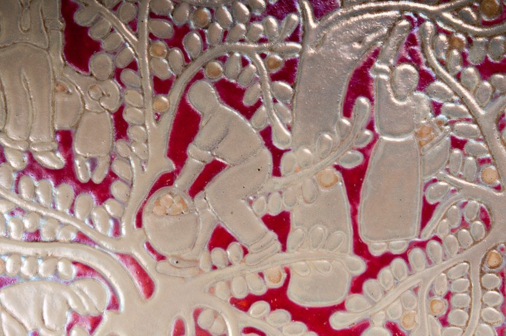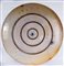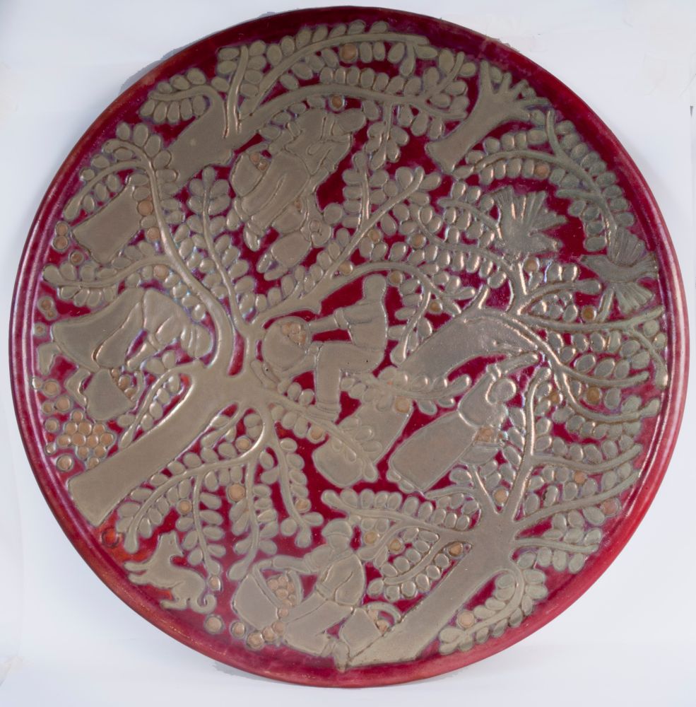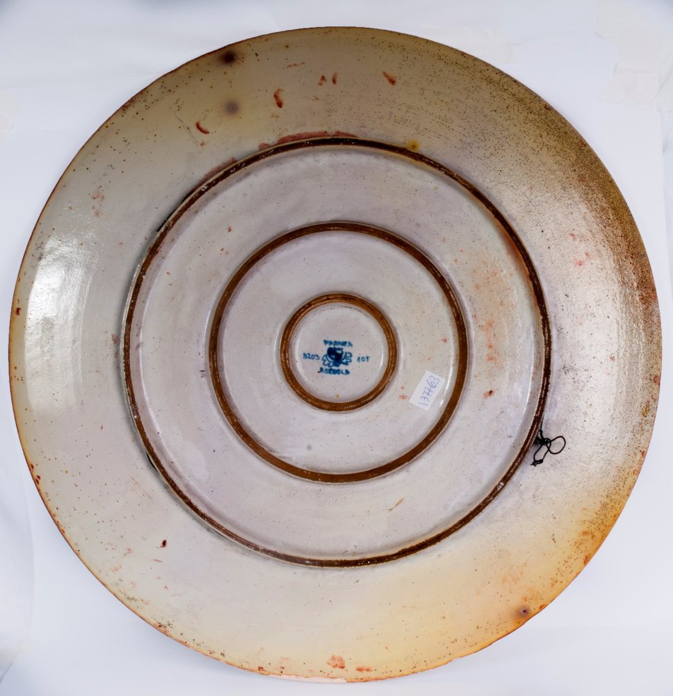 diametro 66 x 5cm piatto da pompa in ceramica policroma a lustro metallico. Piatto liscio con cordone all'orlo e appoggio con doppio piede ad anello. Decoro con rilievo graffito su smalto paglierino pallido ed avorio su fondo rosso. Al retro in blu sotto smalto Faenza Reggia Scuola con la cifra numero 105 ed inventario n. 203. Eseguito con molta probabilità da Melisenda Lama su progetto di Domenico Rambelli. Il piatto fu esposto alla Triennale di Milano nel 1933 .
