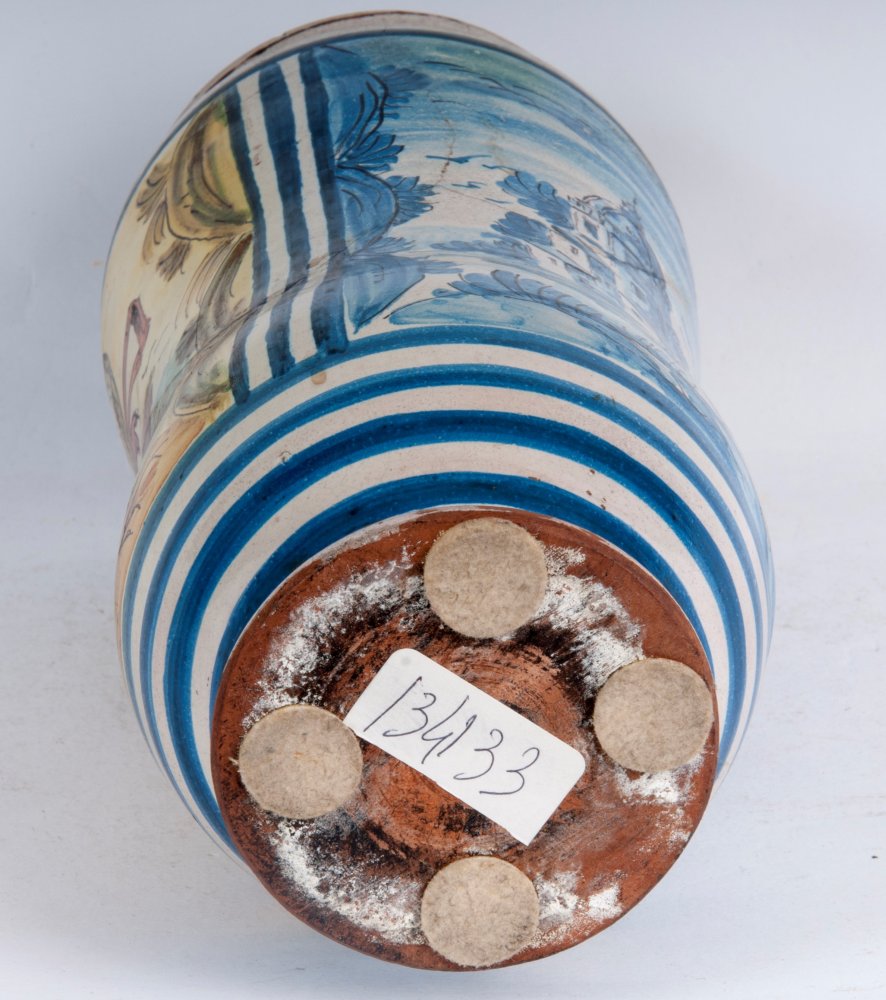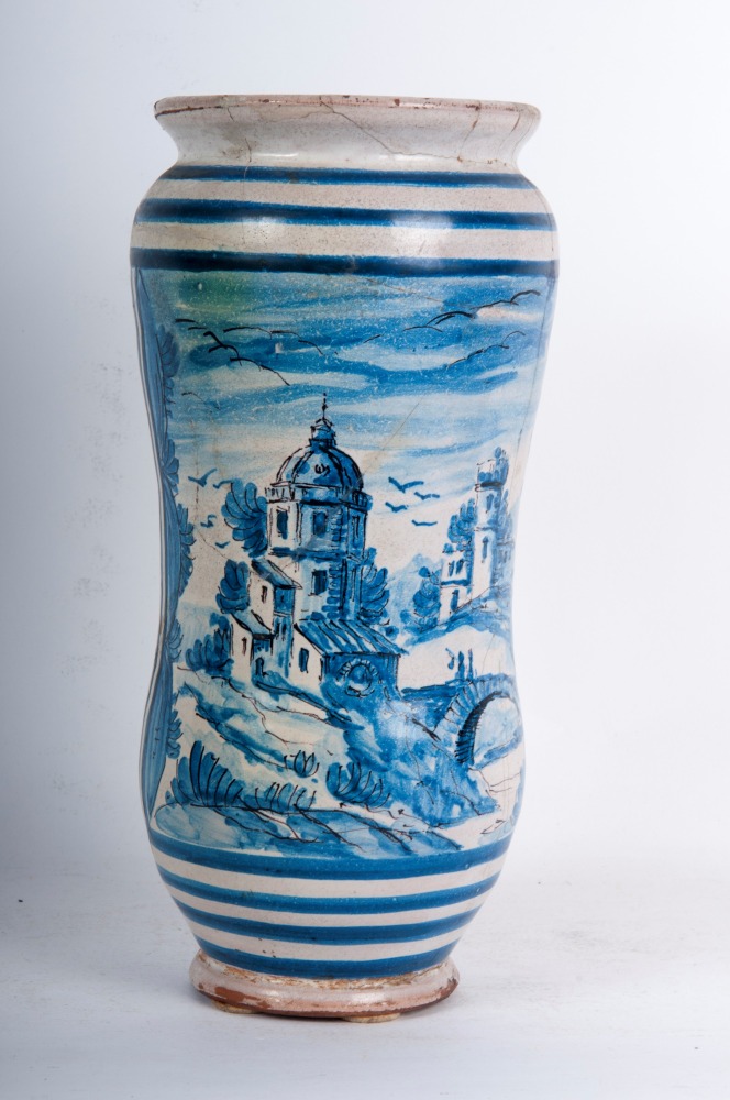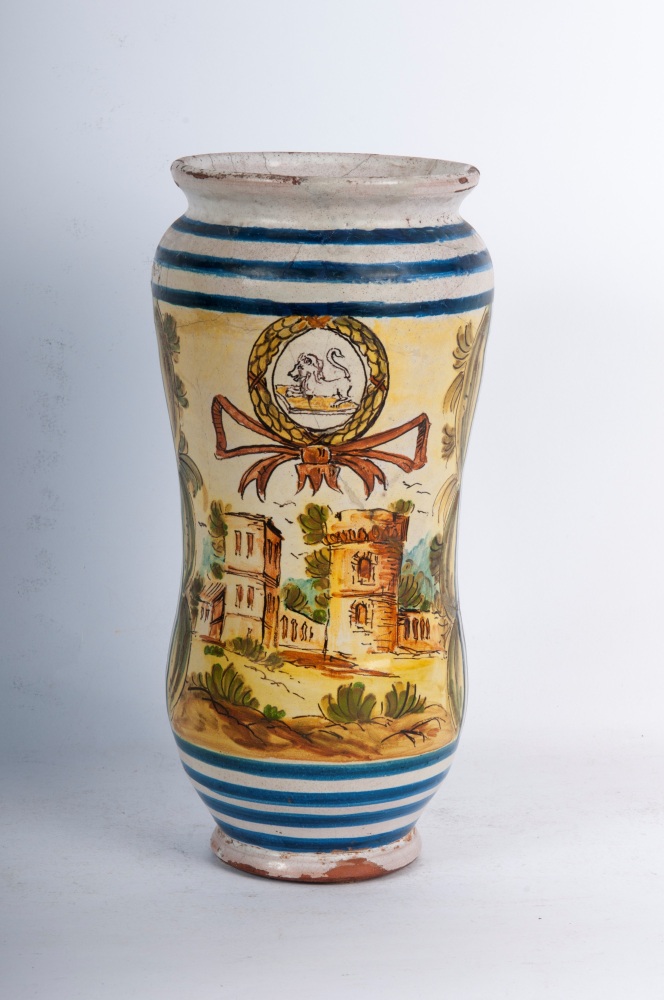 26 x 11 x 7,5 cm corpo rastremato al centro con orlo superiore estroflesso e base a disco. Un lato presenta scena di paesaggio in blu su fondo bianco entro riquadratura, sul lato opposto costruzioni in ocra su fondo giallo e stemma con leone. Officina meridionale , seconda metà XVIII secolo
