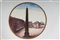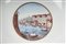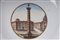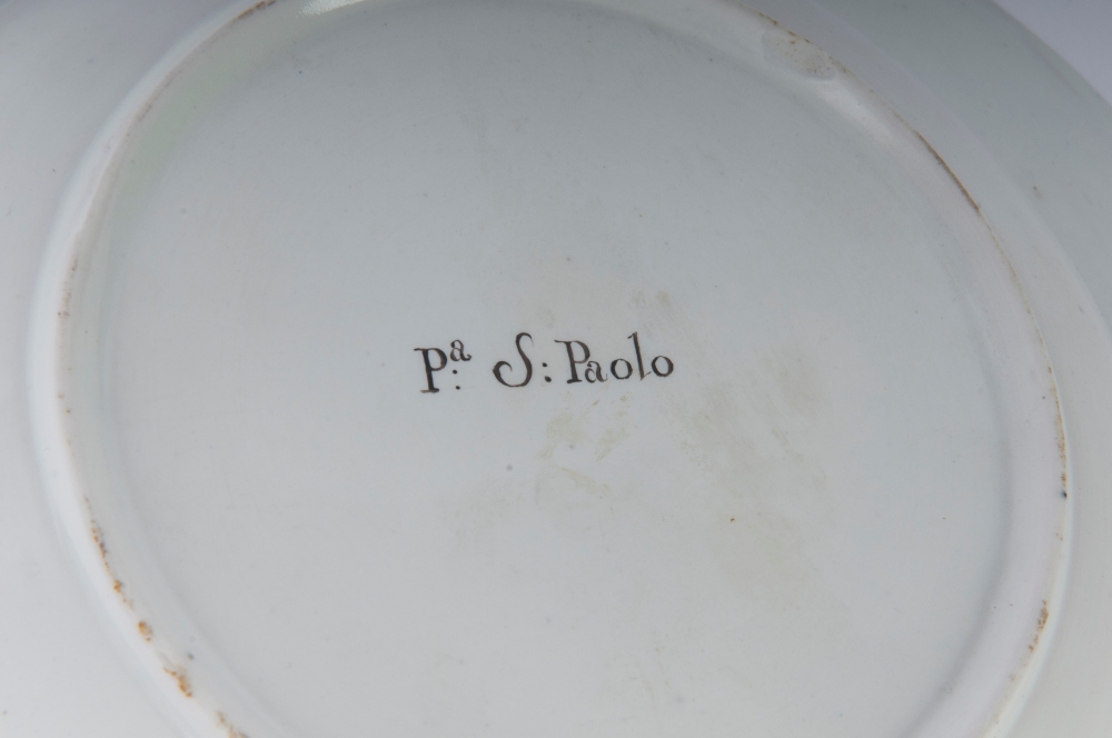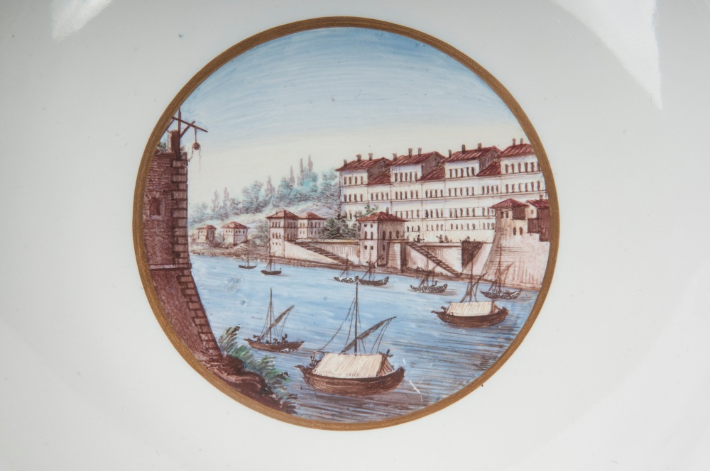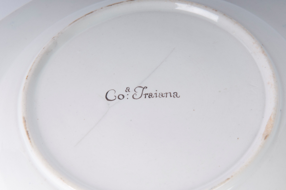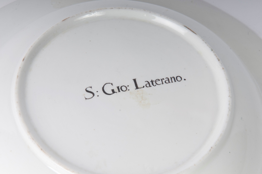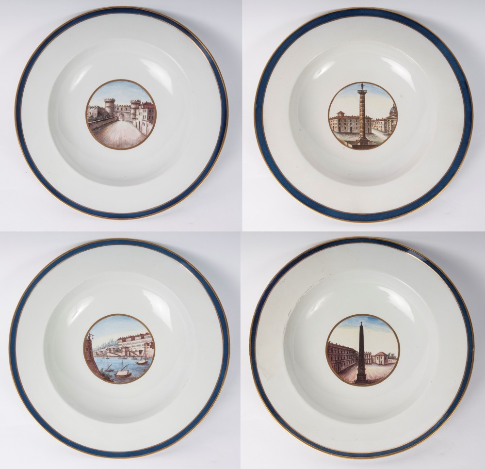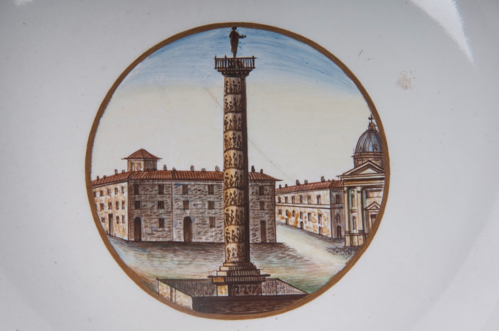 diametro 24,5 x 4,2 x 12 cm Ampia tesa con ripida balza e largo fondo, al retro appoggio ad anello con fondo leggermente ribassato. Decoro con veduta dei monumenti di Roma entro riserva dorata su fondo bianco. Bordo blu cobalto con doppia profilatura in oro zecchino.