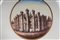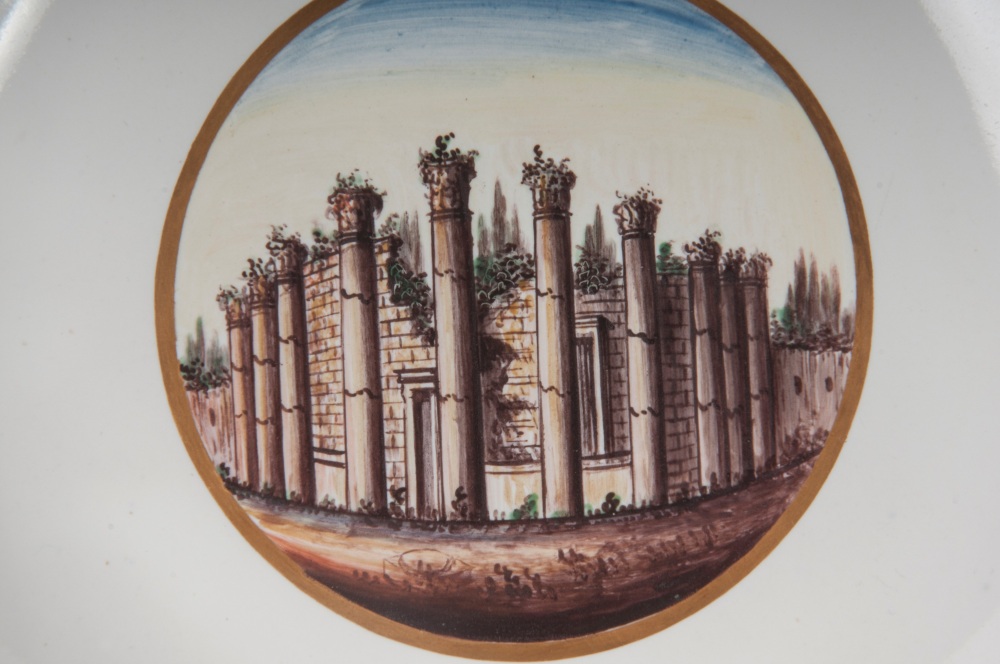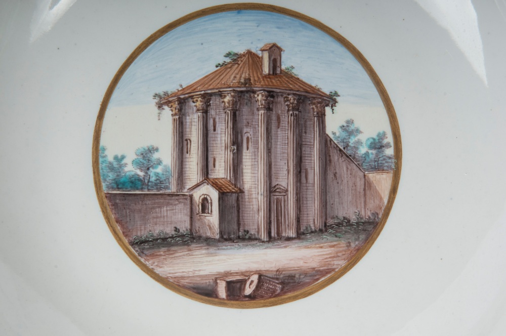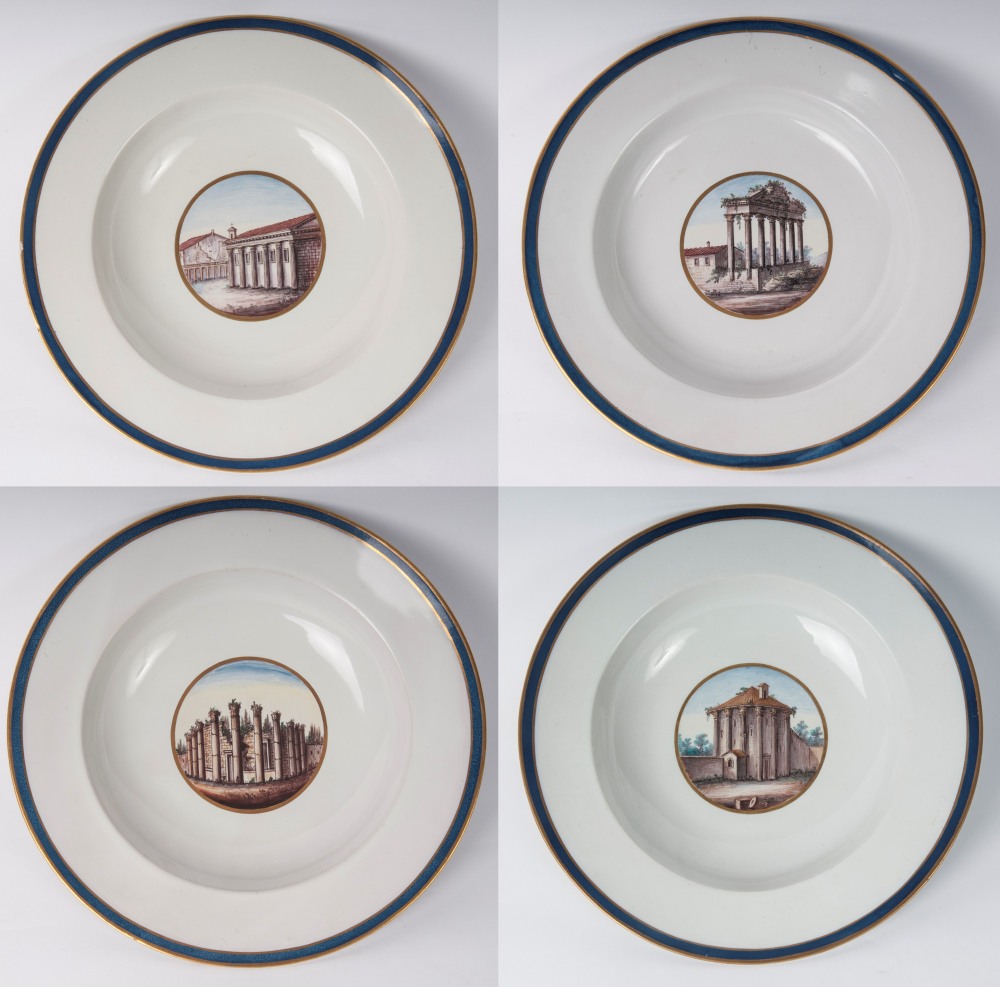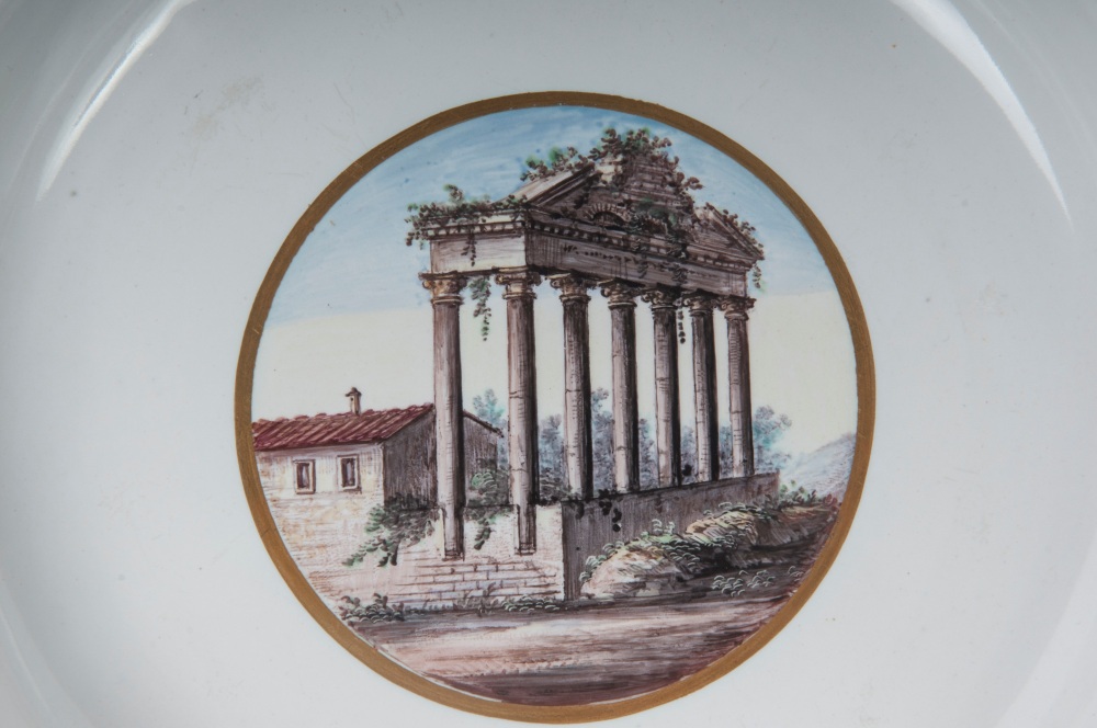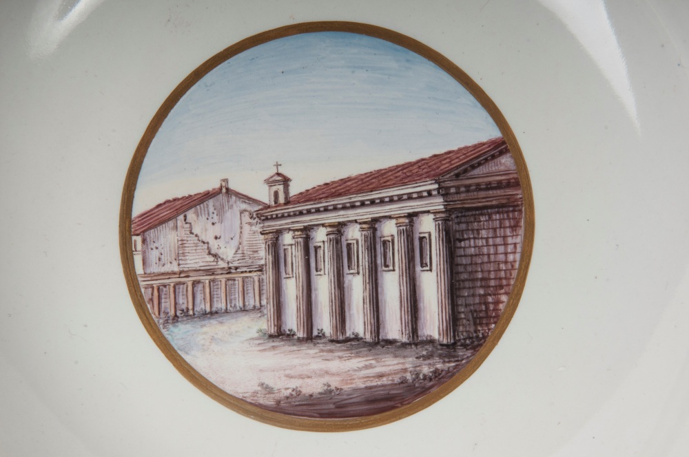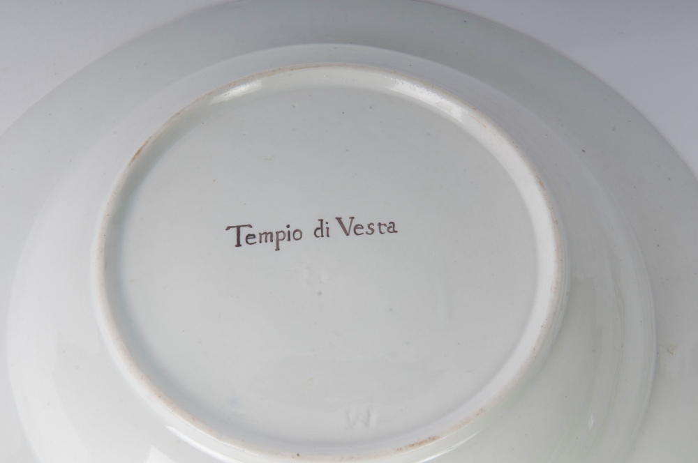 diametro 24,5 x 4 x 12 cm Ampia tesa con ripida balza e largo fondo, al retro appoggio ad anello con fondo leggermente ribassato. Decoro con veduta dei monumenti di Roma entro riserva dorata su fondo bianco. Bordo blu cobalto con doppia profilatura in oro zecchino.