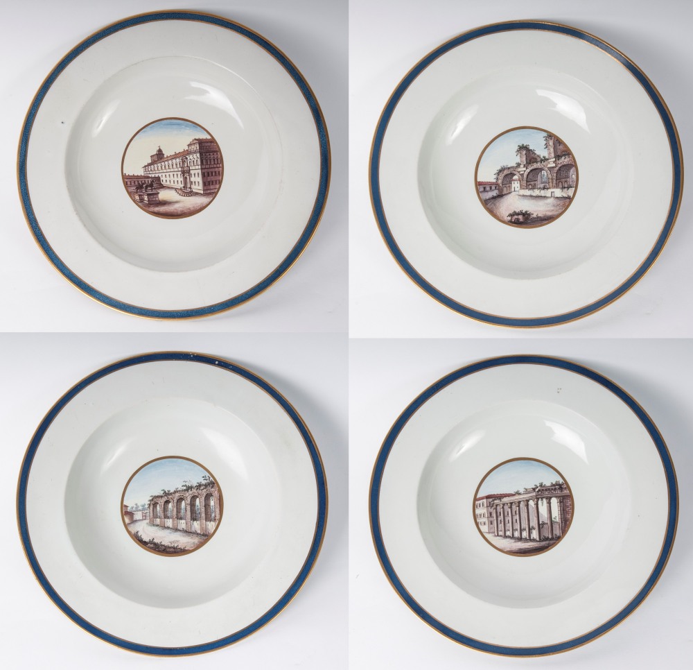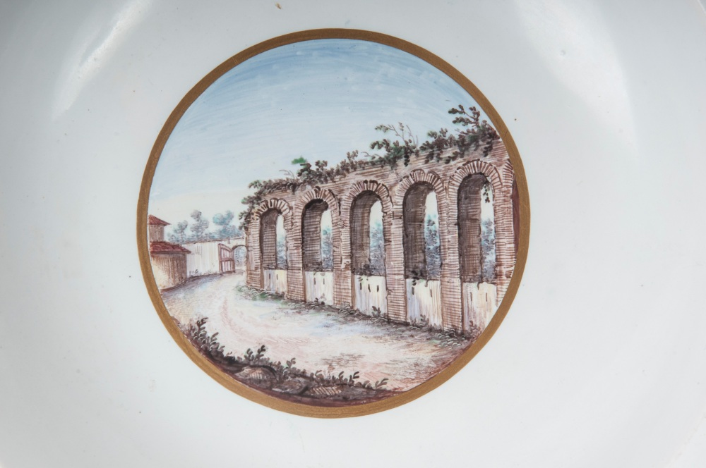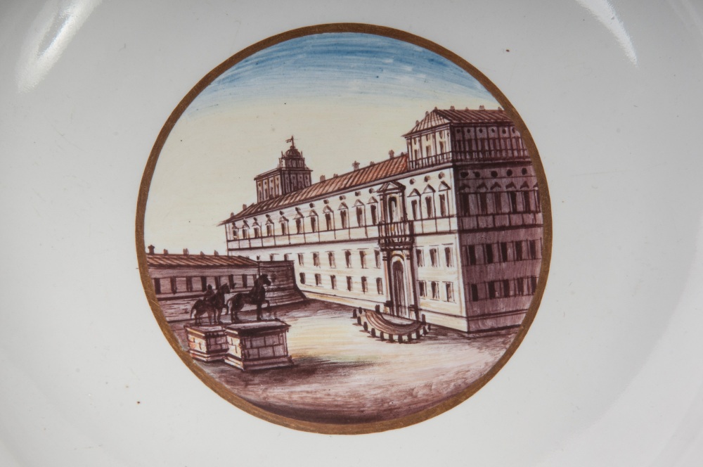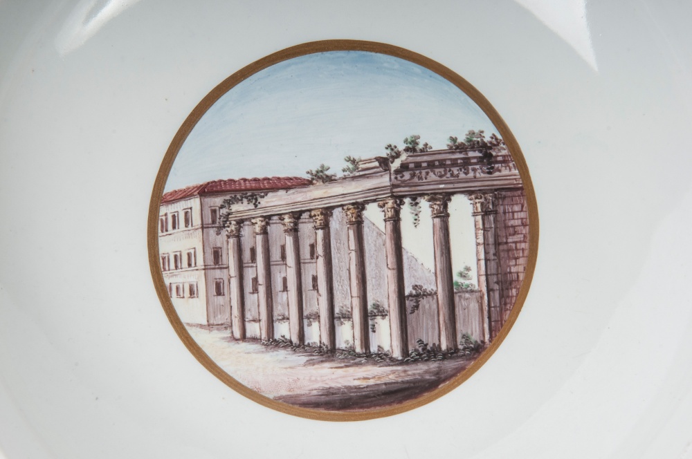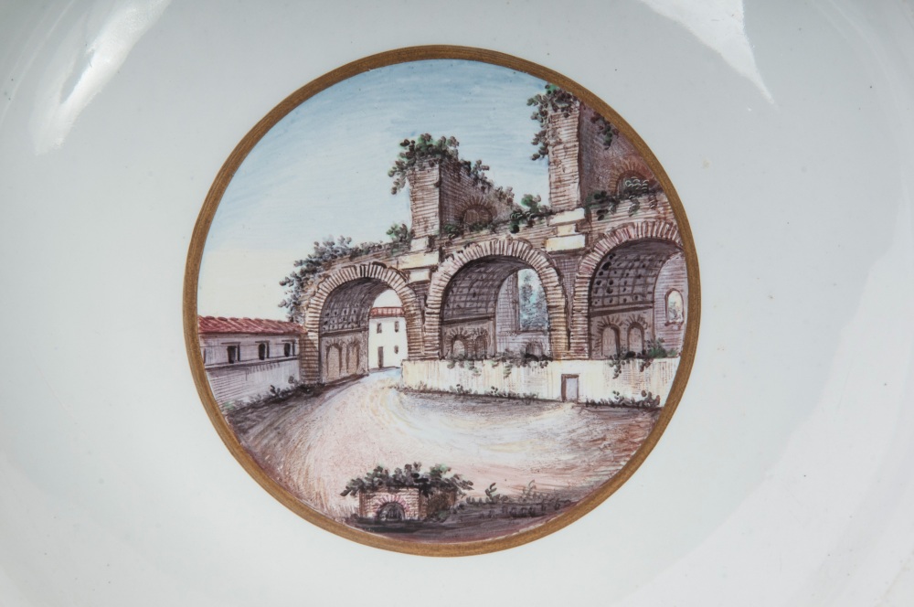 diametro 24 ,5 x 4 x 12 cm Ampia tesa con ripida balza e largo fondo, al retro appoggio ad anello con fondo leggermente ribassato. Decoro con veduta dei monumenti di Roma entro riserva dorata su fondo bianco. Bordo blu cobalto con doppia profilatura in oro zecchino.