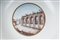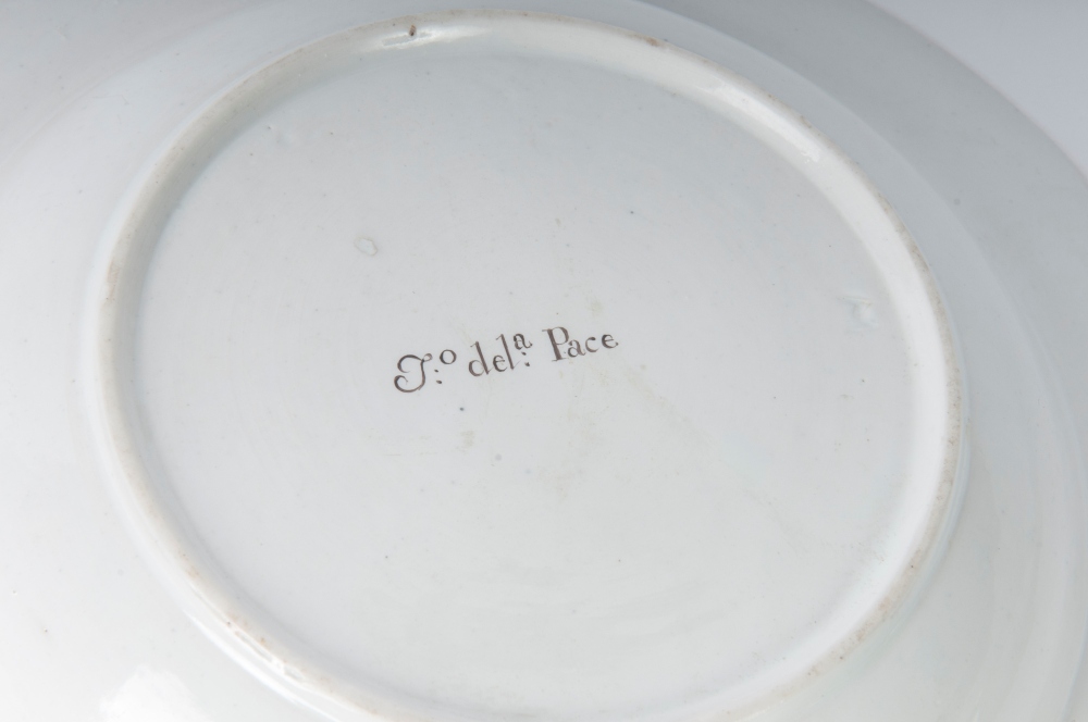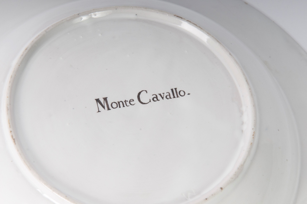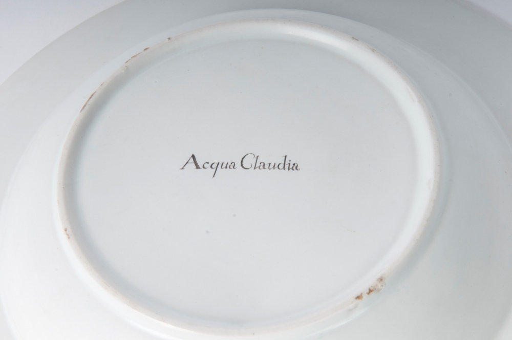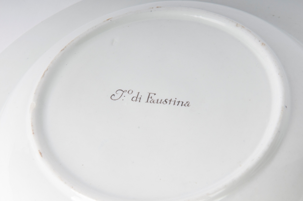 diametro 24 ,5 x 4 x 12 cm Ampia tesa con ripida balza e largo fondo, al retro appoggio ad anello con fondo leggermente ribassato. Decoro con veduta dei monumenti di Roma entro riserva dorata su fondo bianco. Bordo blu cobalto con doppia profilatura in oro zecchino.