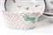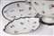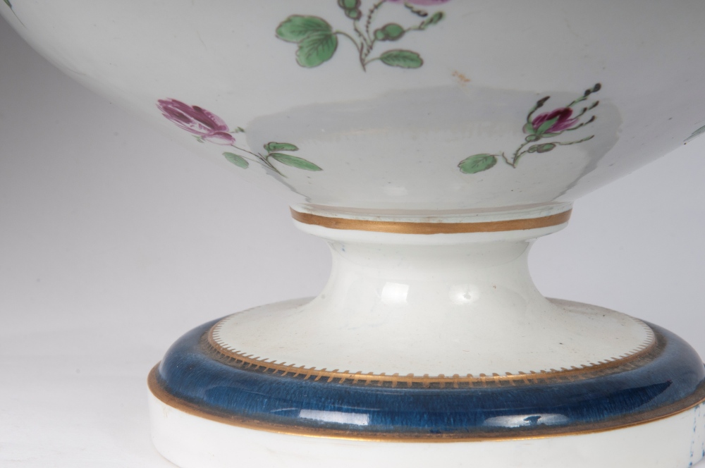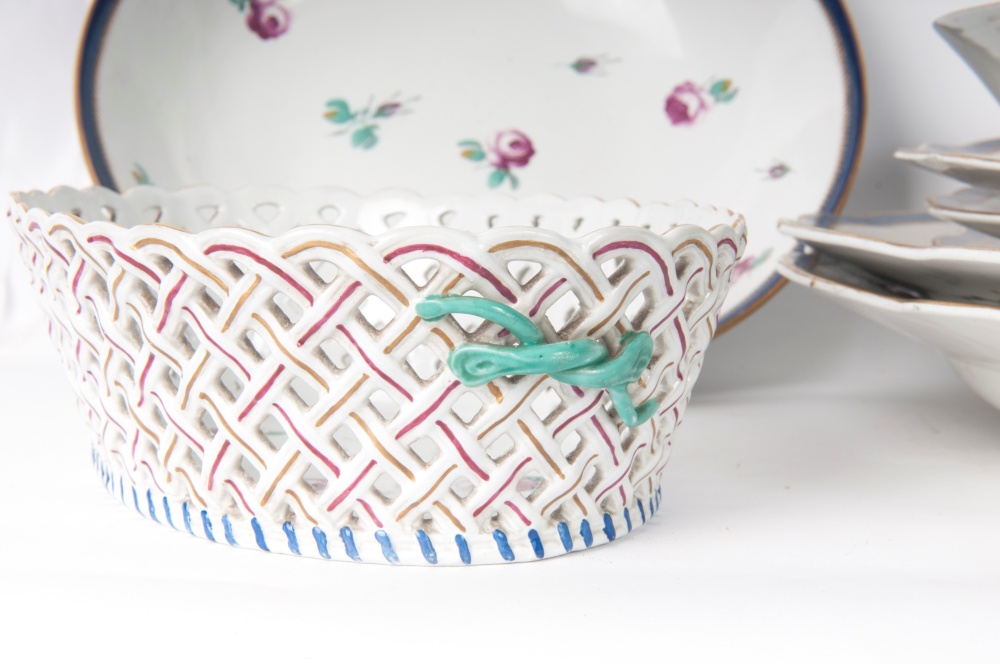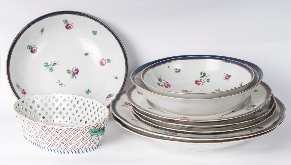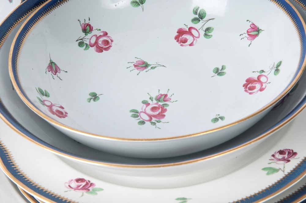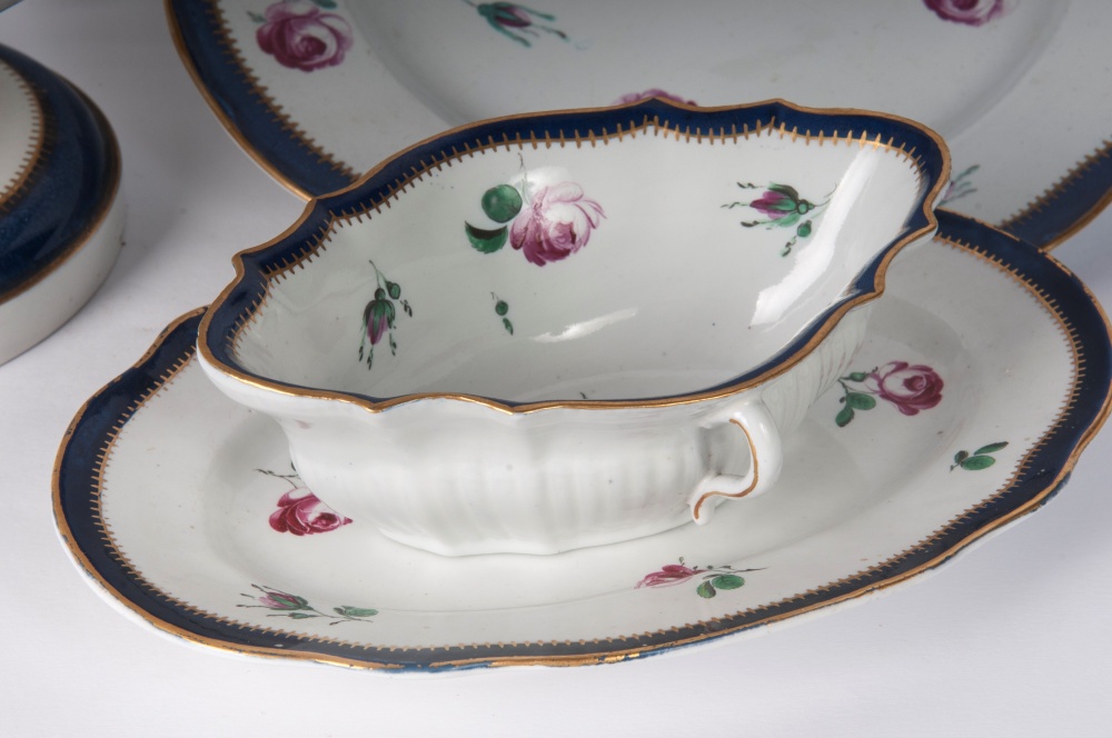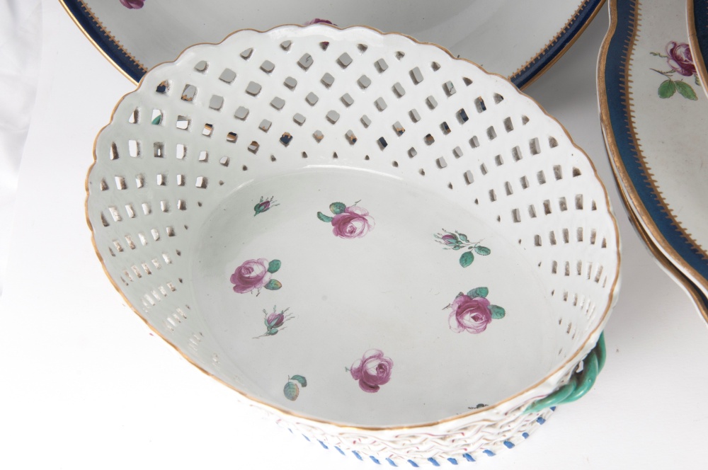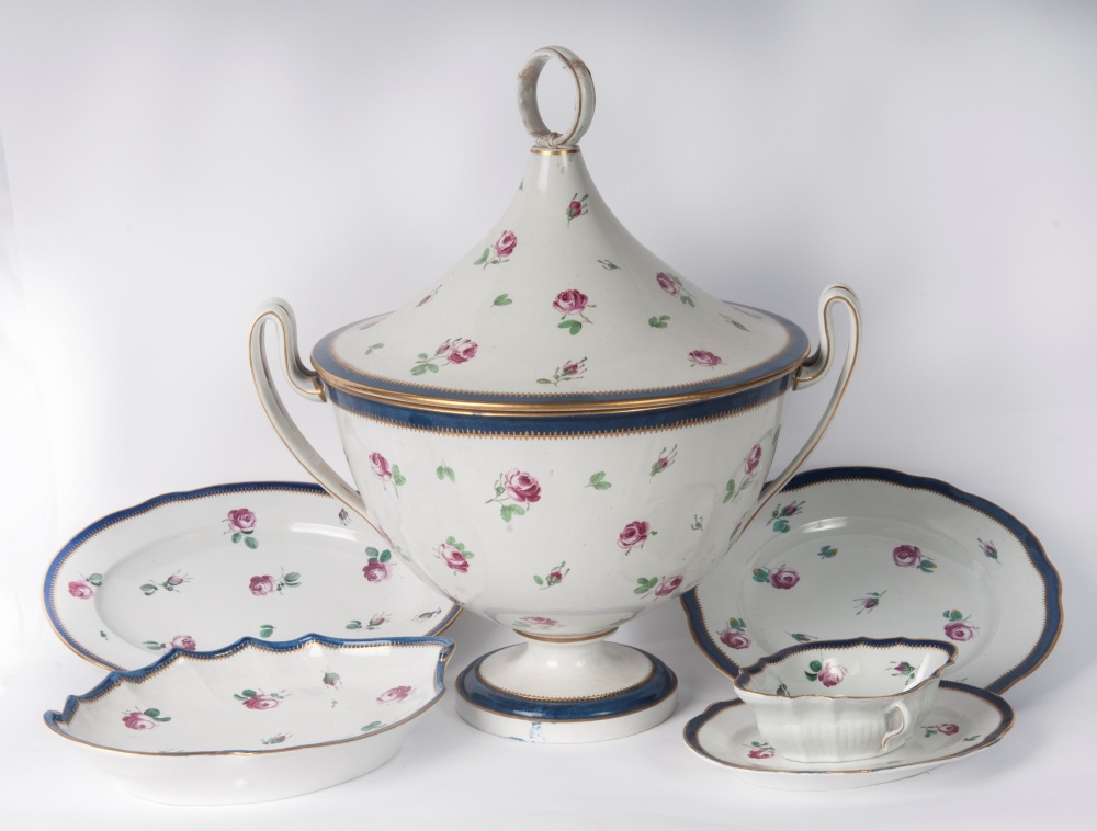 Piatti dal profilo mistilineo con base d'appoggio anulare. Decoro su fondo bianco a roselline e contorno in blu all'orlo con barbe in oro. Profilature in oro zecchino. La coppia di zuppiere è a forma di urna con anse a doppio nastro e presa del coperchio ad anello. Coppia di cestini dalla parete traforata con motivo a vimini intrecciato e prese a filo ritorto. Manifattura Ginori , ultimo quarto XVIII secolo