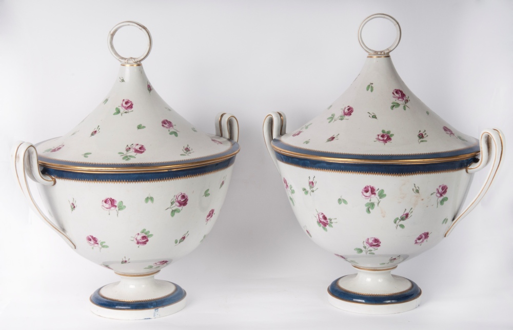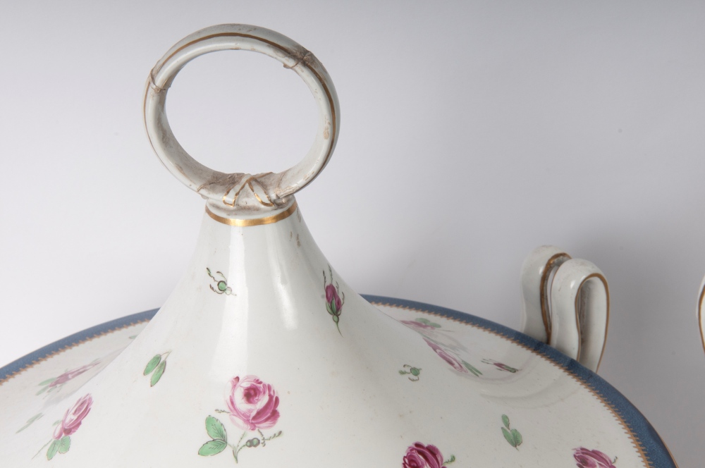 Stato di conservazione: minime mancanze ai bordi, prese dei coperchi delle zuppiere restaurate.