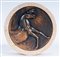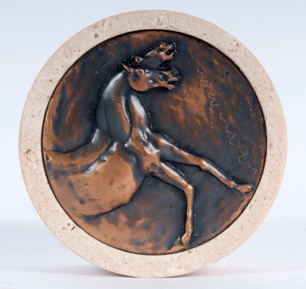 7,2 x 3 cm fermacarte rotondo in travertino con basso rilievo in metallo bronzato. Firmato in confezione originale.