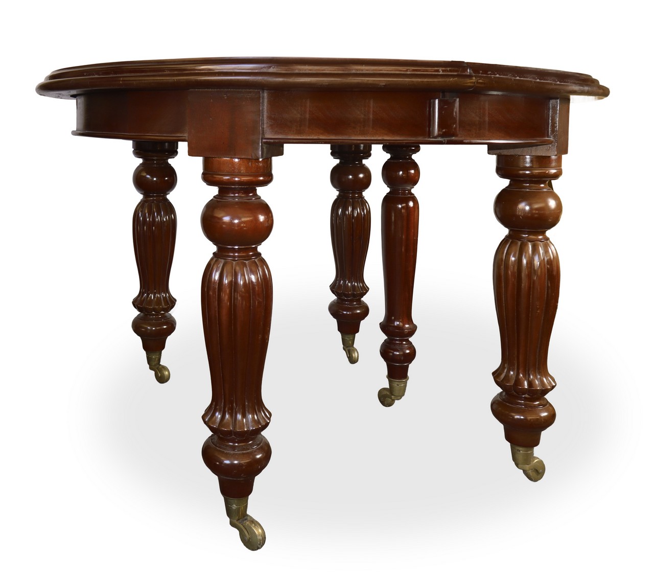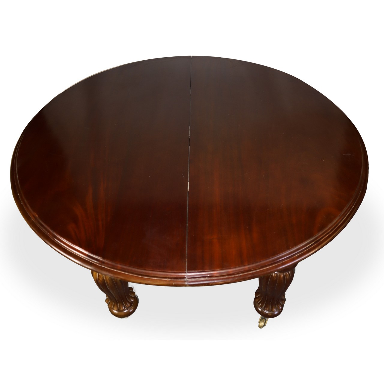 Tavolo rotondo vittoriano in legno di mogano con manovella provvisto di allunghi, Fine 19° secolo h cm 82,5X125 dimensione allunghi (X3) cm 125x49 Piano sostenuto da montanti scolpiti e torniti provvisti di rotelle dotato di n°3 prolunghe Piano sostenuto da montanti scolpiti e torniti provvisti di rotelle dotato di n°3 prolunghe