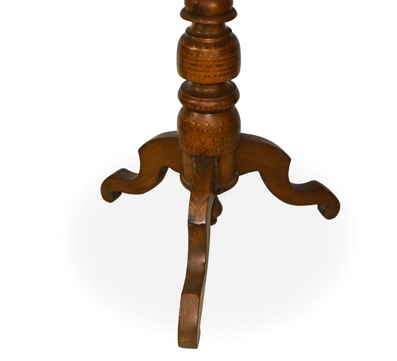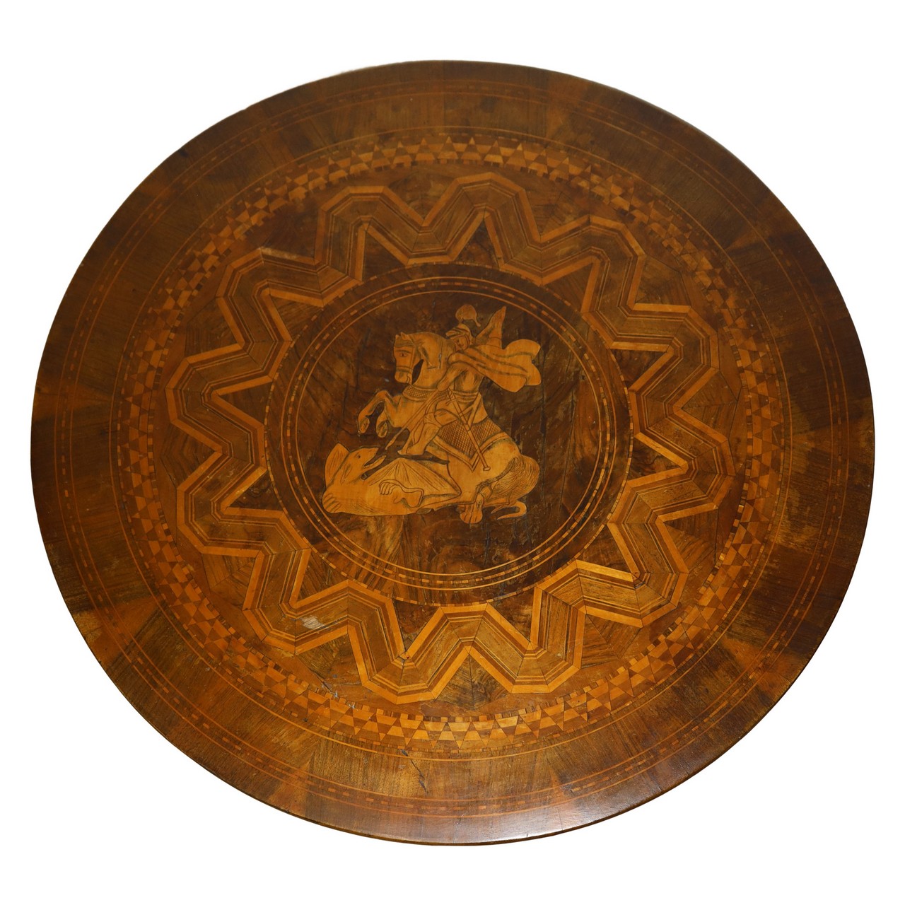 Tavolino rotondo in legno di noce con piede a tre razze e piano intarsiato a motivi geometrici in legni chiari a contrasto con al centro raffigurazione di San Michele Arcangelo, 19° secolo