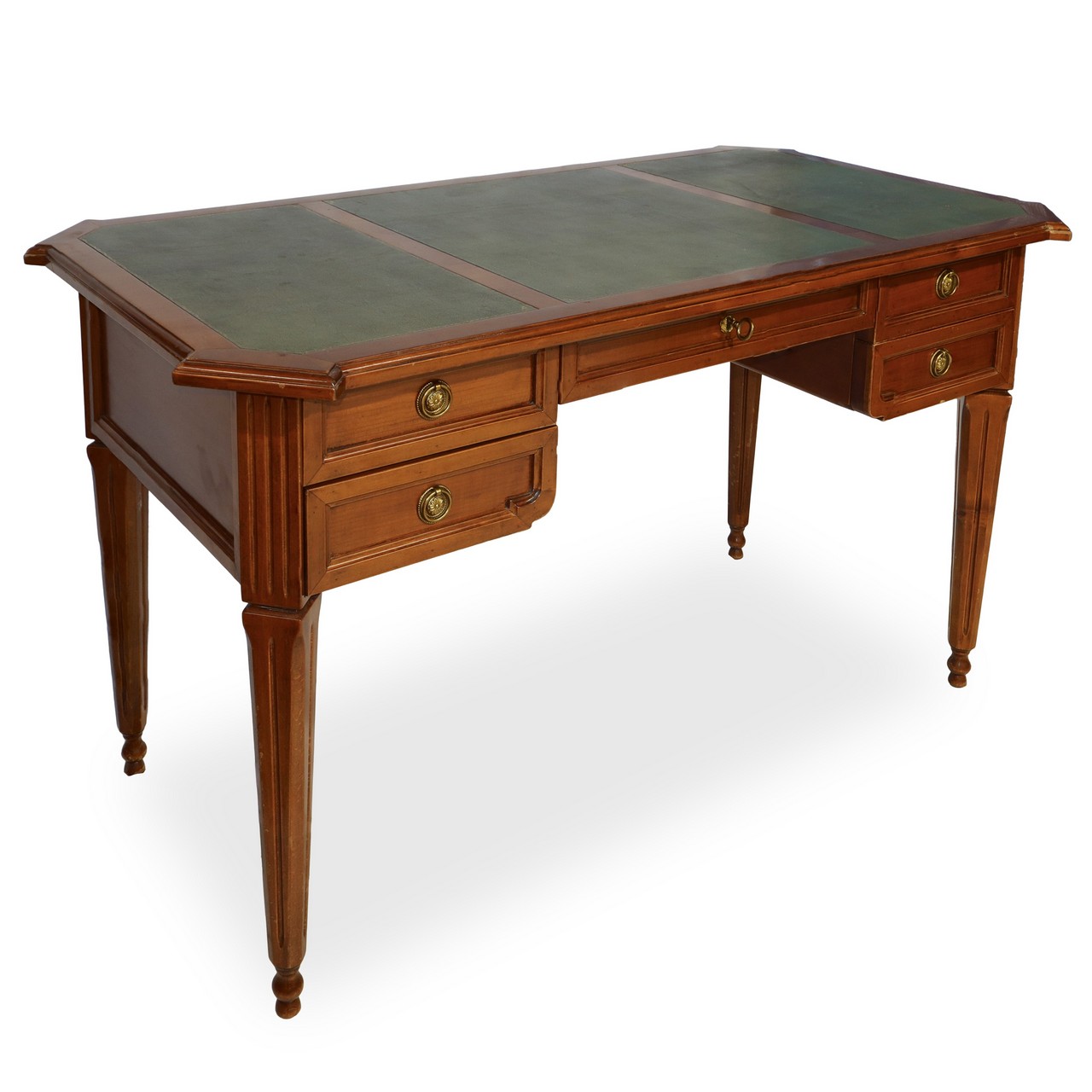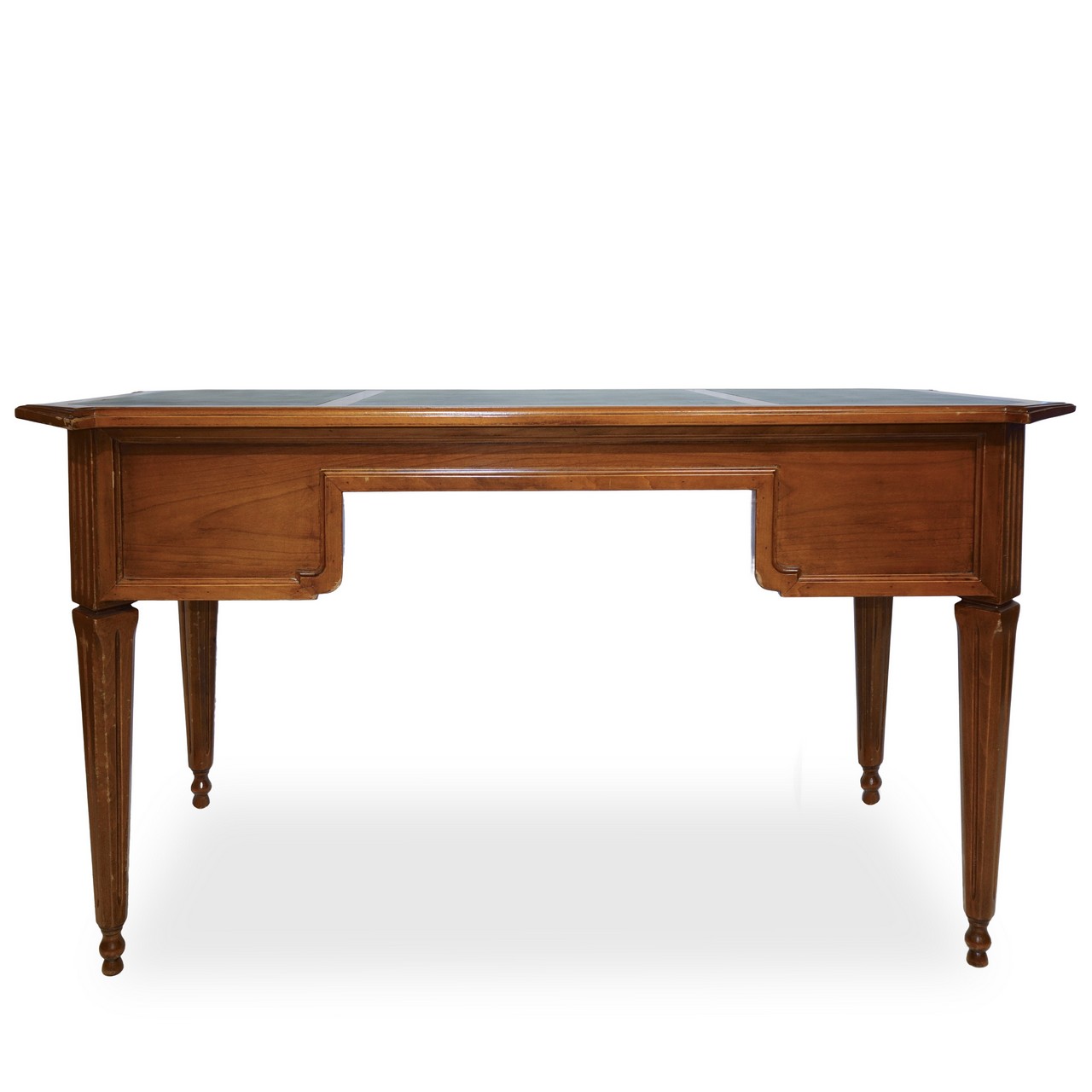 Scrivania in legno di noce chiaro, piano rivestito in pelle, cassetto centrale e cassetti laterali, piedi troncopiraMetàali , primi 20° secolo