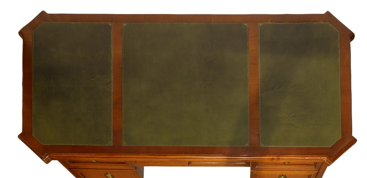 Scrivania in legno di noce chiaro, piano rivestito in pelle, cassetto centrale e cassetti laterali, piedi troncopiraMetàali , primi 20° secolo h cm 80X144X74