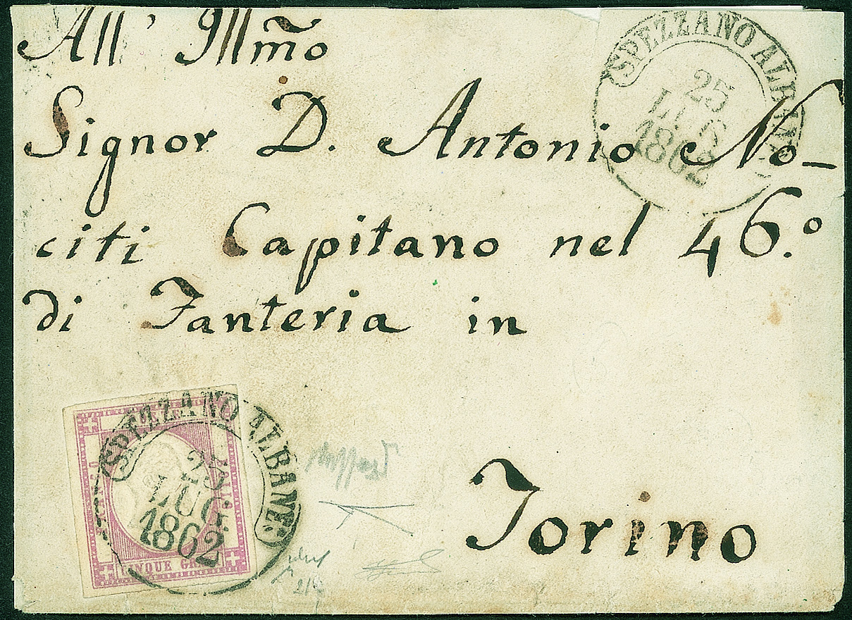 Antichi Stati Italiani - Province Napoletane - Busta affrancata con 5 grana lilla scuro (21d)Diretta ad un 'Capitano nel 46° di fanteria' da Spezzano Albanese 25 LUG.1862 per Torino - non comune