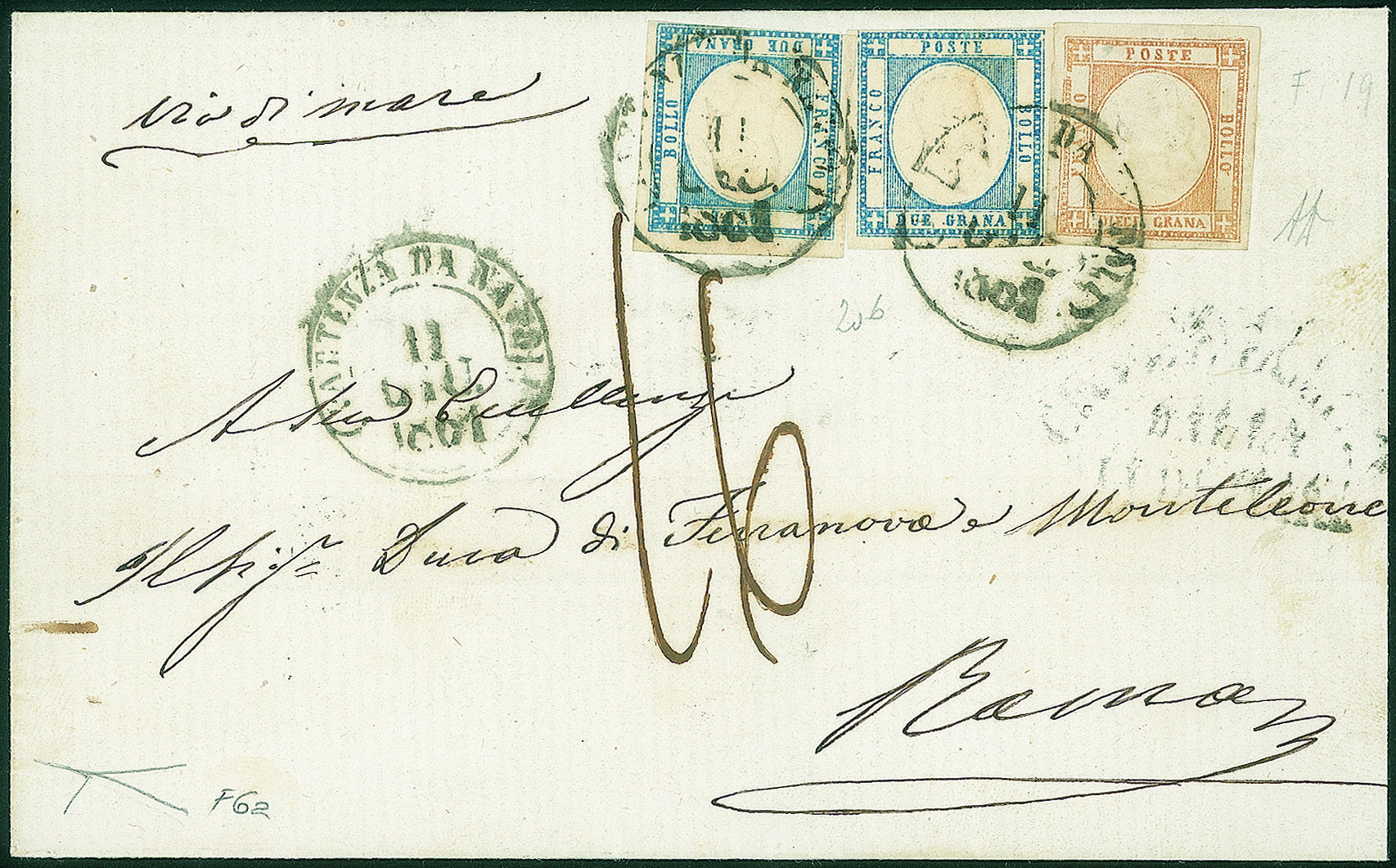 Antichi Stati Italiani - Napoli - Province Napoletane - Sovracoperta di lettera (F6a + 20b)Sovracoperta di lettera affrancata con 10 grana arancio falso per posta del I tipo effige B perfetto e ben marginato + due 2 grana azzurro (F6a + 20b) da Napoli 11 GIU 1861 a Roma - bollo via di mare di Civitavecchia - tassata 16 bajocchi - rara - Cert. Bottacchi