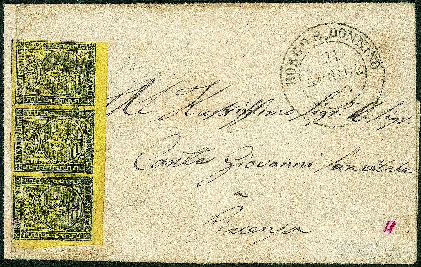 Antichi Stati Italiani - Parma - Lettera affrancata con striscia orizzontale di tre del 5 cent giallo arancioAngolo di foglio (1) con annullo a griglietta + doppio cerchio Borgo S.Donnino 21 APRILE 1859 per Piacenza - firma AD + cert. Raybaudi