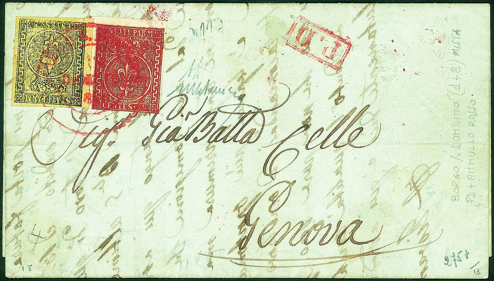 Antichi Stati Italiani - Parma - Lettera affrancata con 5 cent giallo + 25 cent bruno rosso (1 + 8)Con annullo rosso Borgo S.Donnino 12 Dicembre 1856 + bollo in cartella rosso P.D. per Genova - cert. M.Catania