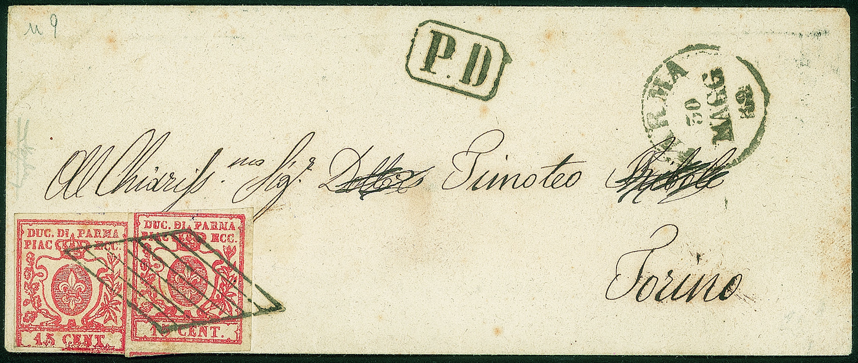 Antichi Stati Italiani - Parma - Busta affrancata con due esemplari del 15 cent vermiglio (9)