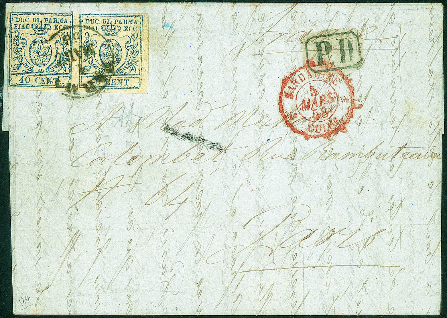 Antichi Stati Italiani - Parma - Lettera affrancata con coppia orizzontale del 40 cent azzurro (11 cat.22000)Entrambi con '0' stretto - da Parma 1 MARZ 58 per Parigi - cert. Alberto Diena