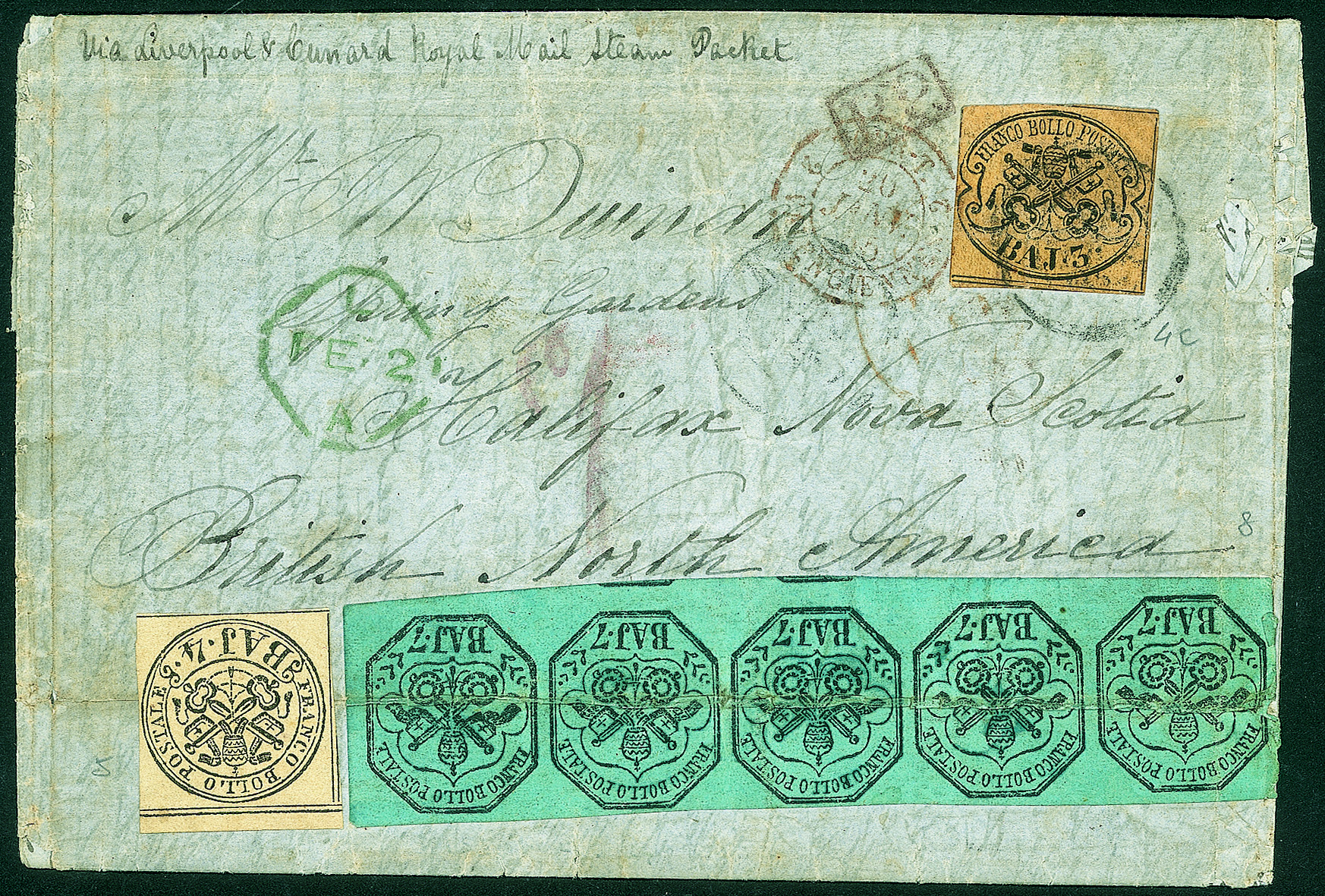 Antichi Stati Italiani - Stato Pontificio - Lettera (4c) + 4 baj + striscia di cinque esemplari del 7 baj azzurroLettera affrancata per 42 bajocchi composta da un 3 baj camoscio (4c) + 4 baj (applicato nuovo senza gomma per risìcostruire l'originale affrancatura andata perduta) + striscia di cinque esemplari del 7 baj azzurro (sfuggita all'annullamento) - partita da Romanel gennaio 1855 e arrivata ad Halifax (Nuova Scozia) il 14 febbraio 1855 - bollo d'ingresso in Francia del 30 gennaio + bollo inglese in azzurro verdastro per il transito del 2 febbraio e bollo a tampone da 1 penny per il credito canadese da riscuotere per il trasporto con i vapori inglesi - difetti ma una delle pochissime lettere note per questa destinazione - cert. Manzoni