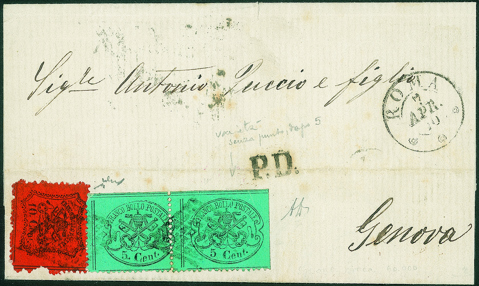 Antichi Stati Italiani - Stato pontificio - Lettera affrancata con coppia del 5 cent azzurro chiaroCon un esemplare senza punto dopo la cifra + 10 cent arancio vermiglio (25 + 25h + 26 cat.700) da Roma 7 APR. 70 per Genova con bollo P.D. - firma AD e Chiavarello