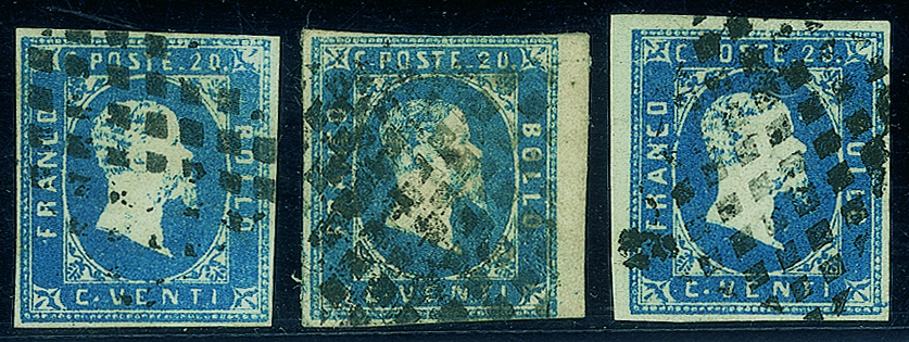 Antichi Stati Italiani - Sardegna - 1851 - Lotto di tre esemplari del 20 cent azzurro (2)