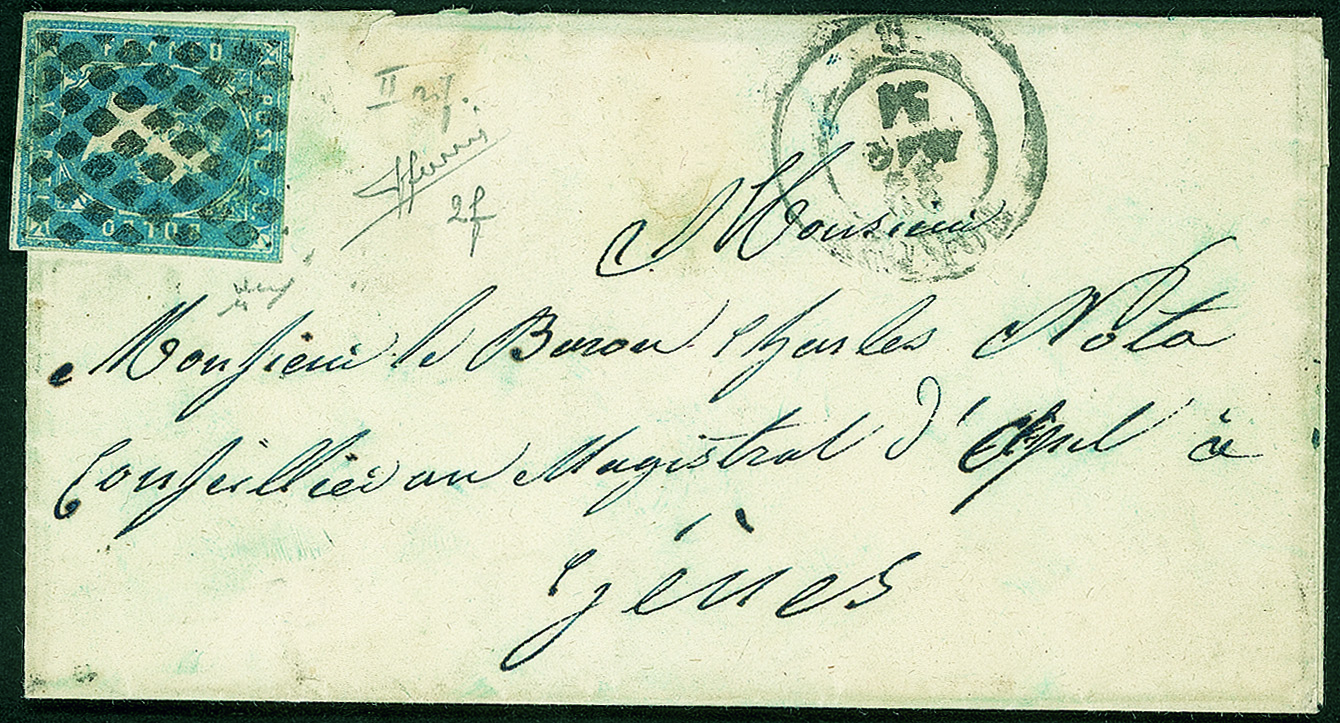 Antichi Stati Italiani - Sardegna - Piccola lettera affrancata con 20 cent azzurro chiaro da Torino 22 MAG.51 per GenovaPrimo mese d'uso dell'annullo a rombi (2f cat.2100) - firma Chiavarello e Sorani