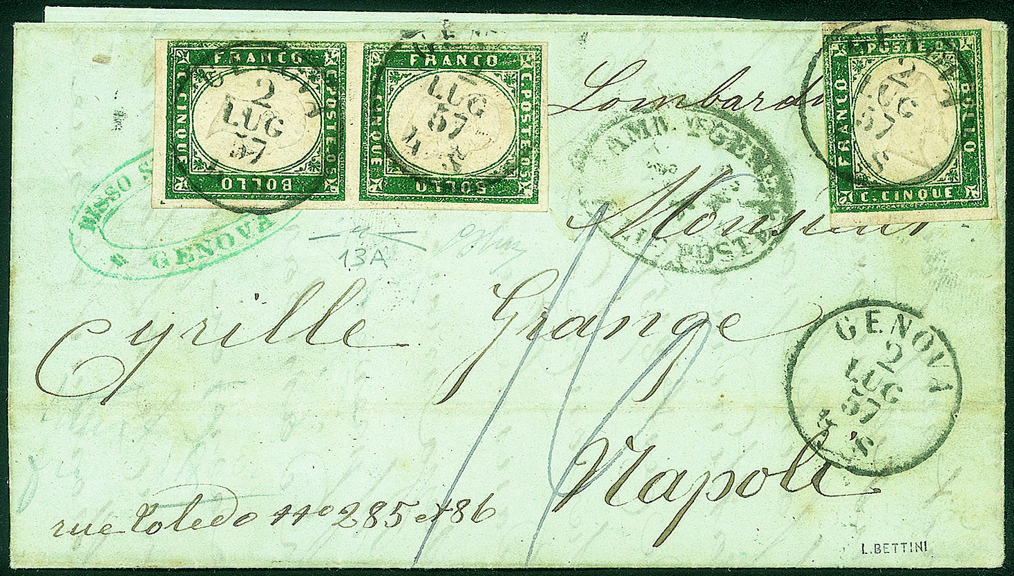 Antichi Stati Italiani - Sardegna - Lettera affrancata con coppia verticale + singolo del 5 cent verde mirto (13A)Margini perfetti - da Genova 2 LUG 57 per Napoli con il vapore 'Lombardo' - firma Oliva + cert. Manzoni