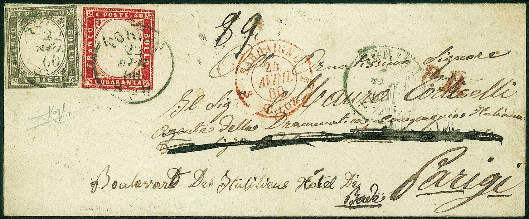 Antichi Stati Italiani - Sardegna - Bustina affrancata con 10 cent bruno grigiastro + 40 cent vermiglio mattone (14Bd + 16Ba)Da Torino 22 APR 60 per Parigi - cert Raybaudi Luigi