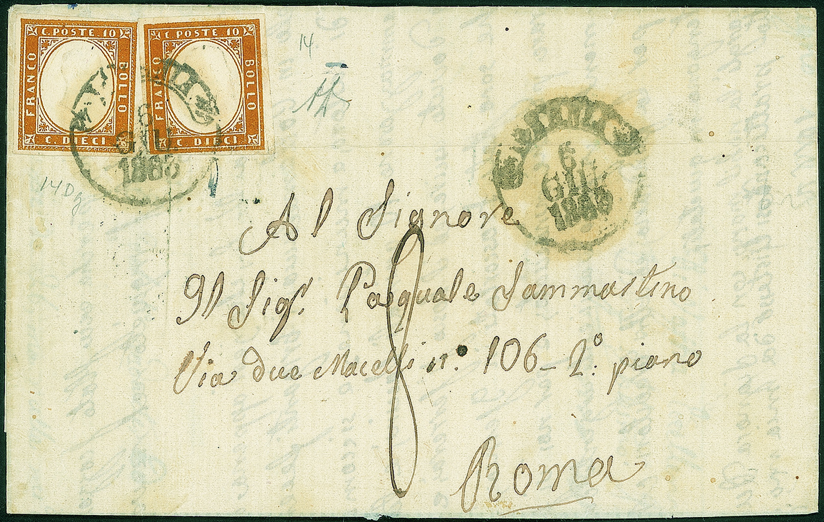 Antichi Stati Italiani - Sardegna - Due esemplari del 10 cent arancio brunastro (14Dg)Annullati con bollo borbonico Isernia 6 GIU.1863 su lettera per Roma con tassa pontificia di 8 bajocchi - al verso annullo dell'ambulante Napoli-Isoletta molto bene impresso - firma AD