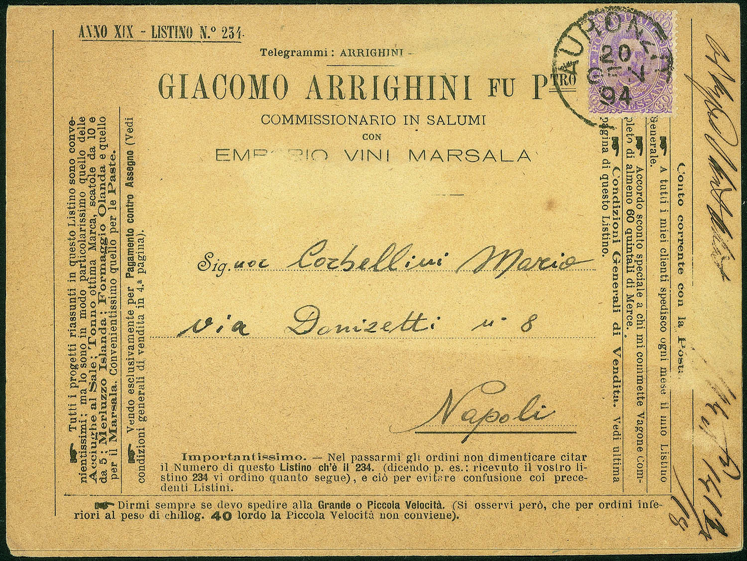 Regno - Umberto I - Listino affrancato per triplo porto con 60 cent violetto Umberto (47 cat.950)Da Auronzo 20 GEN 94 per Napoli - insieme molto interessante