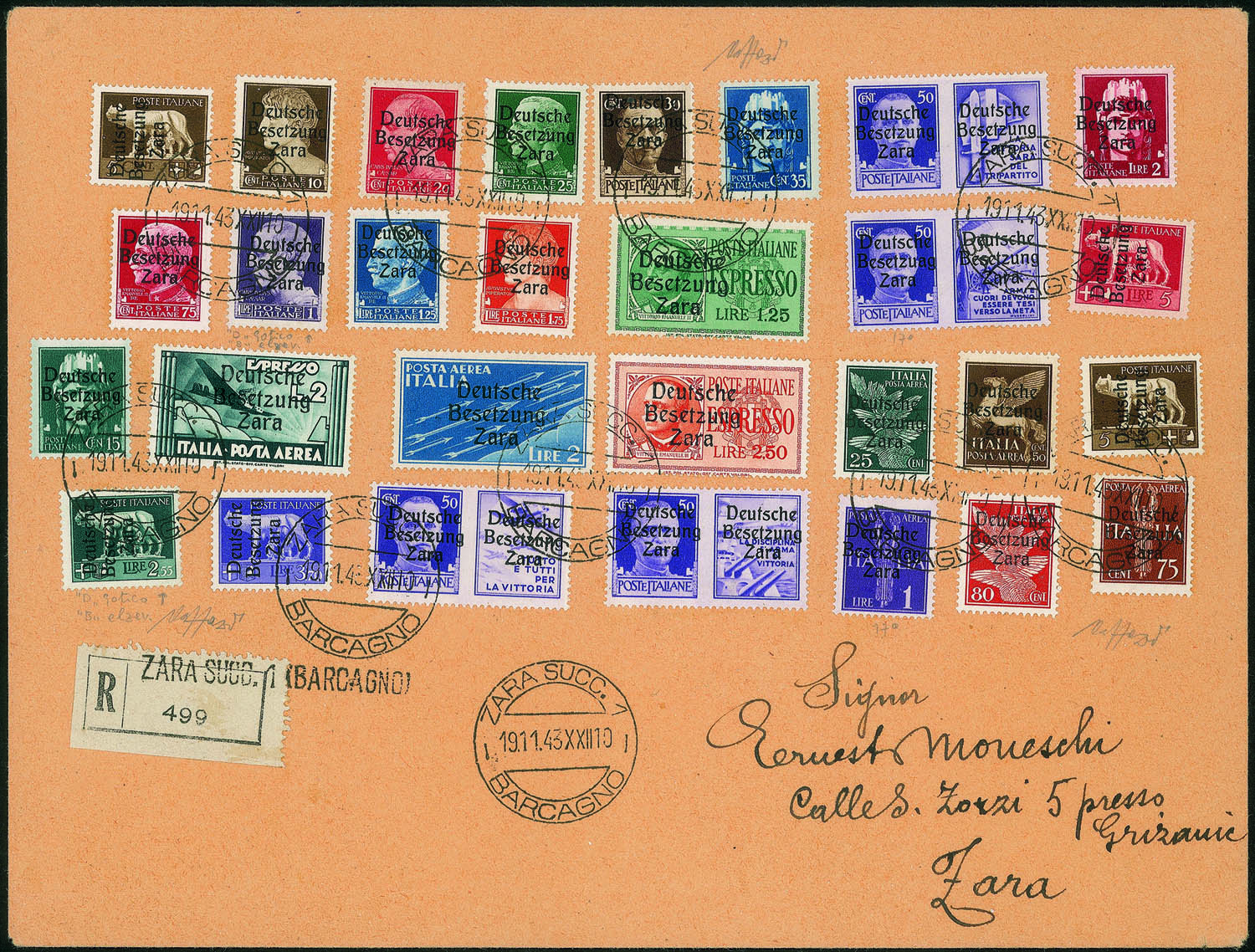 Occupazioni II guerra mondiale - Occupazione Tedesca - Zara - Bustone 29 valoriOccupazione Tedesca - Zara - Bustone raccomandato affrancato con 29 valori di posta ordinaria, aerea, espressi e propaganda - insieme di notevole rarità - cert Caffaz