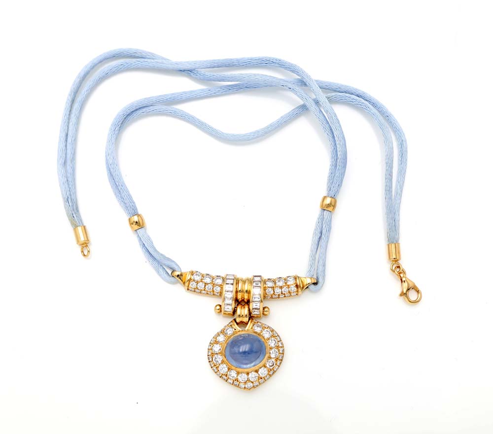 Pendente in oro, diamanti e zaffiro cabochon Oro giallo 750/000. Diamanti in...