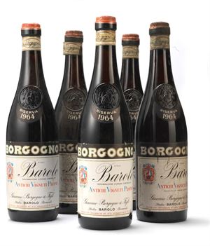 GIACOMO BORGOGNO & FIGLI Lotto di n. 5 bottiglie: Barolo Riserva 1964 Rosso, lt. 0,75