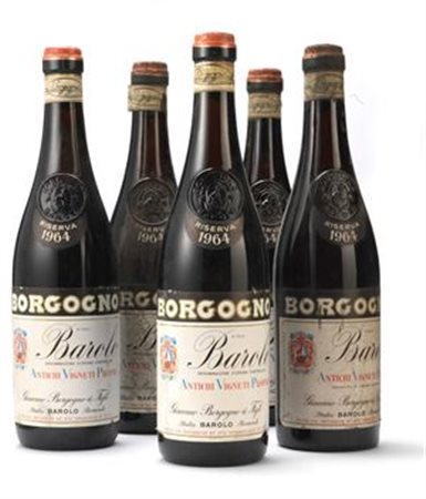 GIACOMO BORGOGNO & FIGLI Lotto di n. 5 bottiglie: Barolo Riserva 1964 Rosso,...