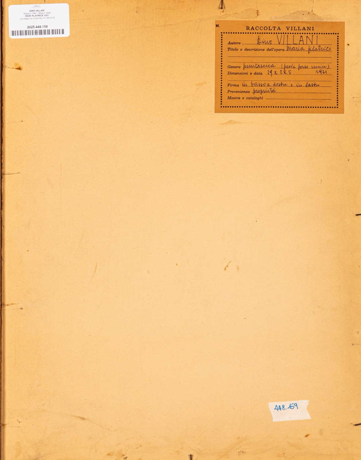 Provenienza: "Raccolta Villani" etichetta al retro con dettagli dell'opera.