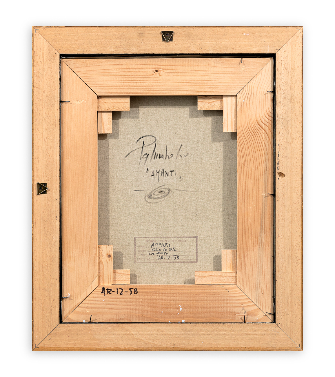 Firma, titolo e timbro dello Studio d'Arte Palumbo recante titolo, tecnica, misure e numero di archiviazione al retro