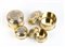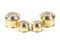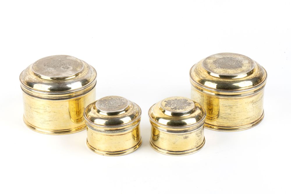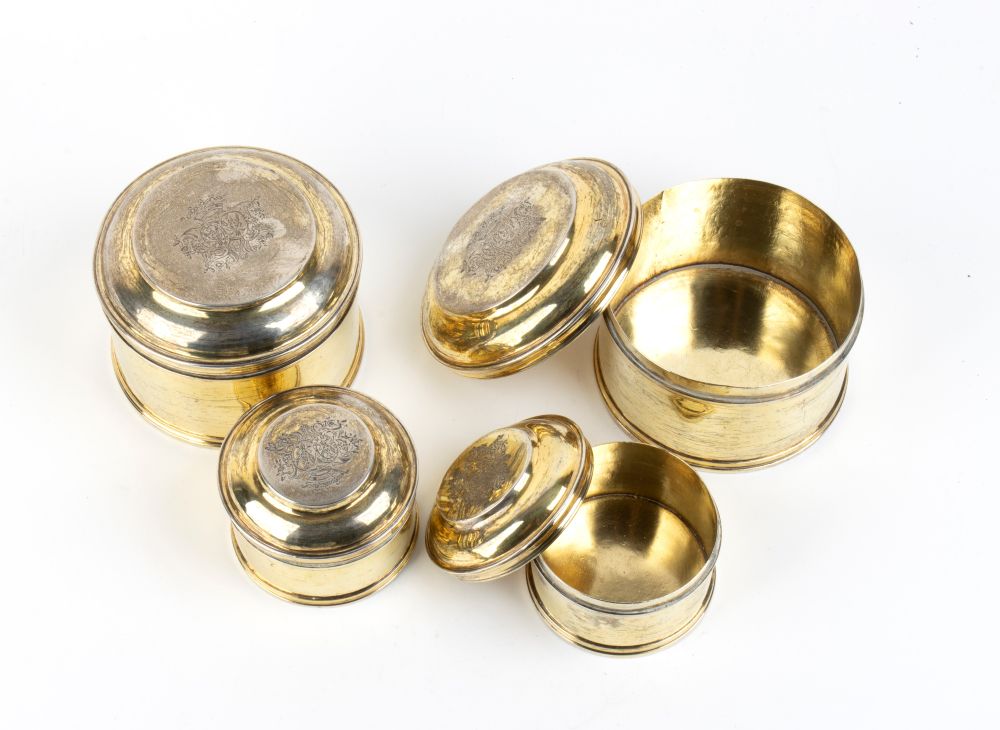 di forma cilindrica di diverse dimensioni. I corpi delle scatole mostrano una finitura dorata, con striature orizzontali e anelli di rinforzo sulla base. I coperchi bombati presentano una decorazione finemente incisa (un monogramma o un cartiglio)